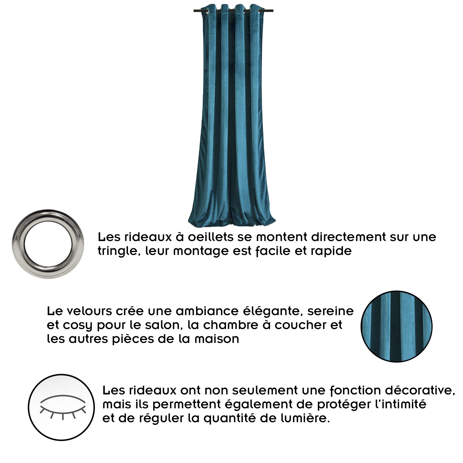 Ce rideau à oeillets est en velours. Le velours un bon choix si vous recherchez un modèle de rideau simple mais qui ajoute un style élégant à votre intérieur.
