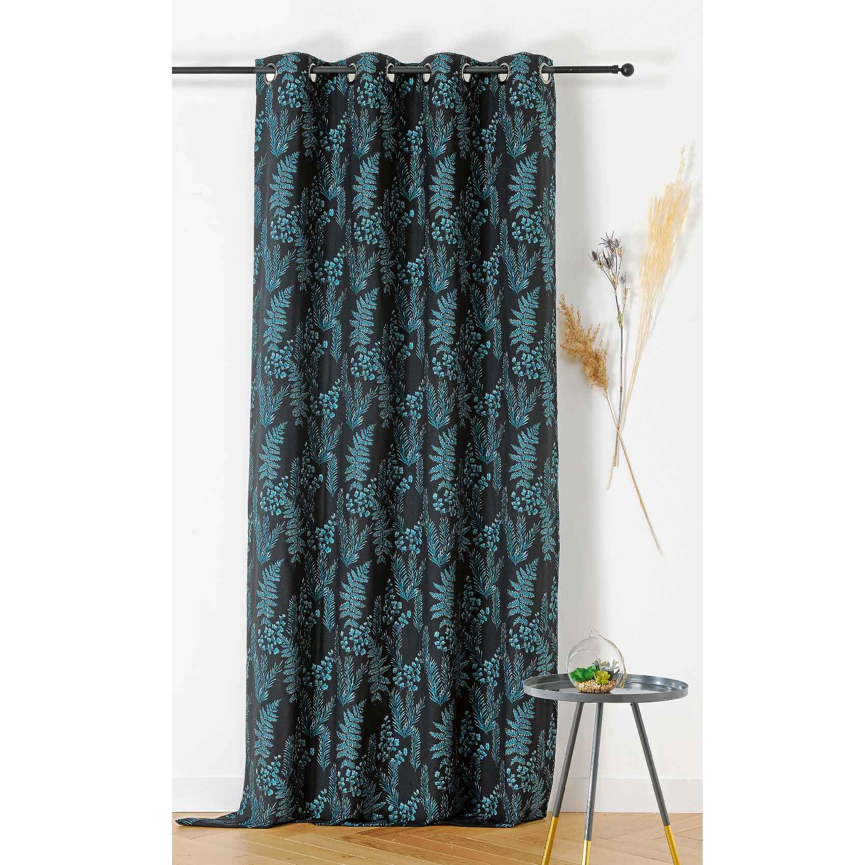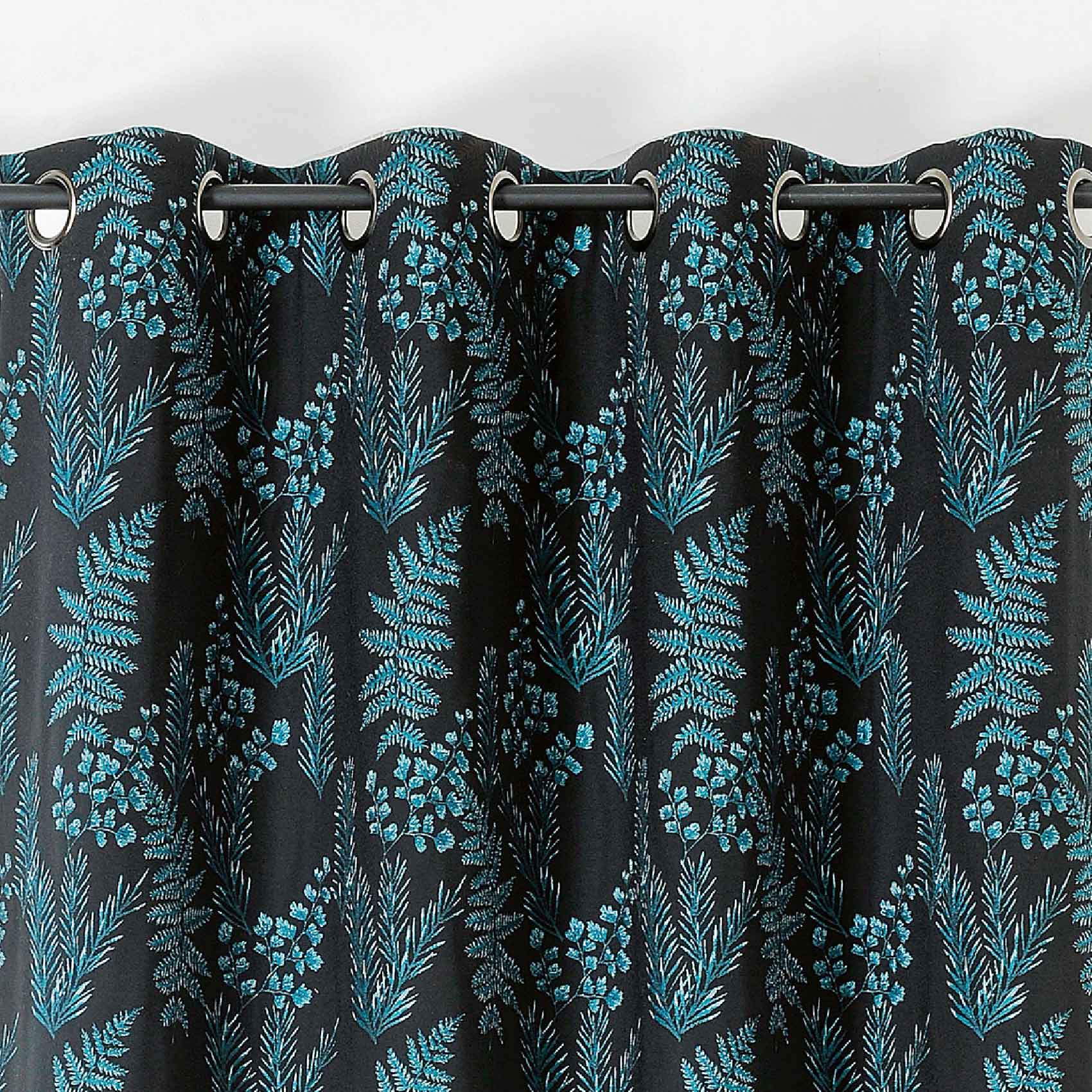 Ce rideau d'ameublement au dessin délicat sur fond noir se compose de branchage de fougères,. de capillaires et de sapins qui embellira votre intérieur. Grâce à son effet relief, le motif apportera une touche de nature à votre déco. Idéal pour mettre en valeur votre pièce à vivre dans un esprit chic et cossu. Sa composition est la suivante : 67% polyester, 31% coton et 2% autres fibres. Tissé et teint dans le respects des normes françaises. Lavable en machone à 30°C. Vendu à l'unité. Prêt à poser. Un tissu au mètre et une housse de coussin assortis sont disponibles sur notre site.