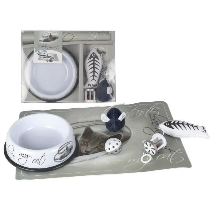 | Libellé | RIGA Coffret I Love My Cat - 1 set de protection 43 x 28 cm - 1 ecuelle - 4 articles pour lexercice et la distraction - Pour cha |