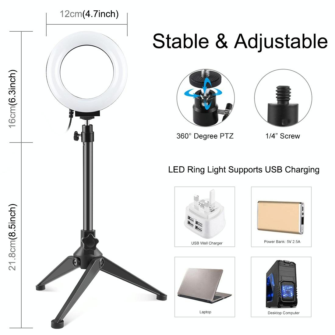La conception légère et le trépied rotatif à 360 degrés permettent un ajustement facile de l'angle. Alimentez votre Ring Light via USB pour une utilisation flexible où que vous soyez.