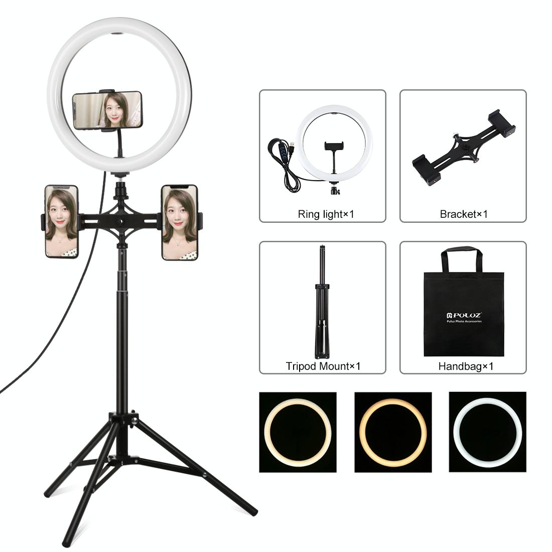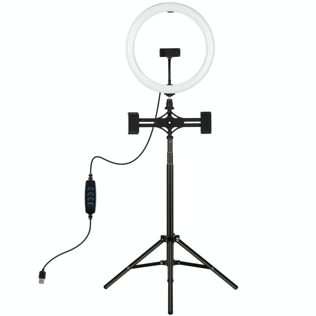 La Ring Light est alimentée par USB, compatible avec divers appareils. Le support double pour téléphone permet des diffusions en direct et des selfies en toute simplicité.