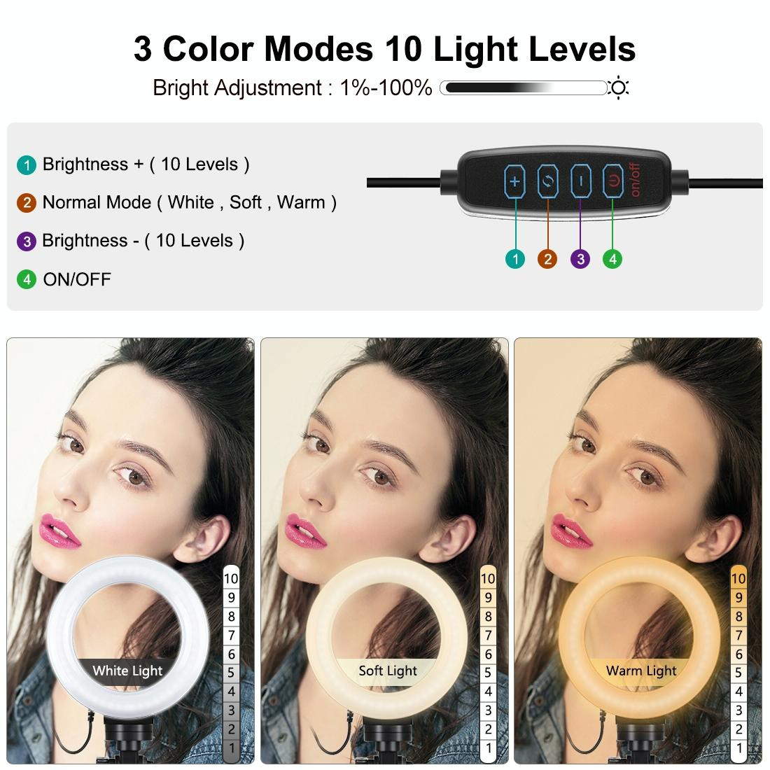 Modes d'éclairage ajustables pour chaque occasionChoisissez parmi 3 modes de couleur et ajustez la luminosité selon vos besoins. Que ce soit pour un portrait ou une vidéo, notre Ring Light s'adapte à toutes les situations.
