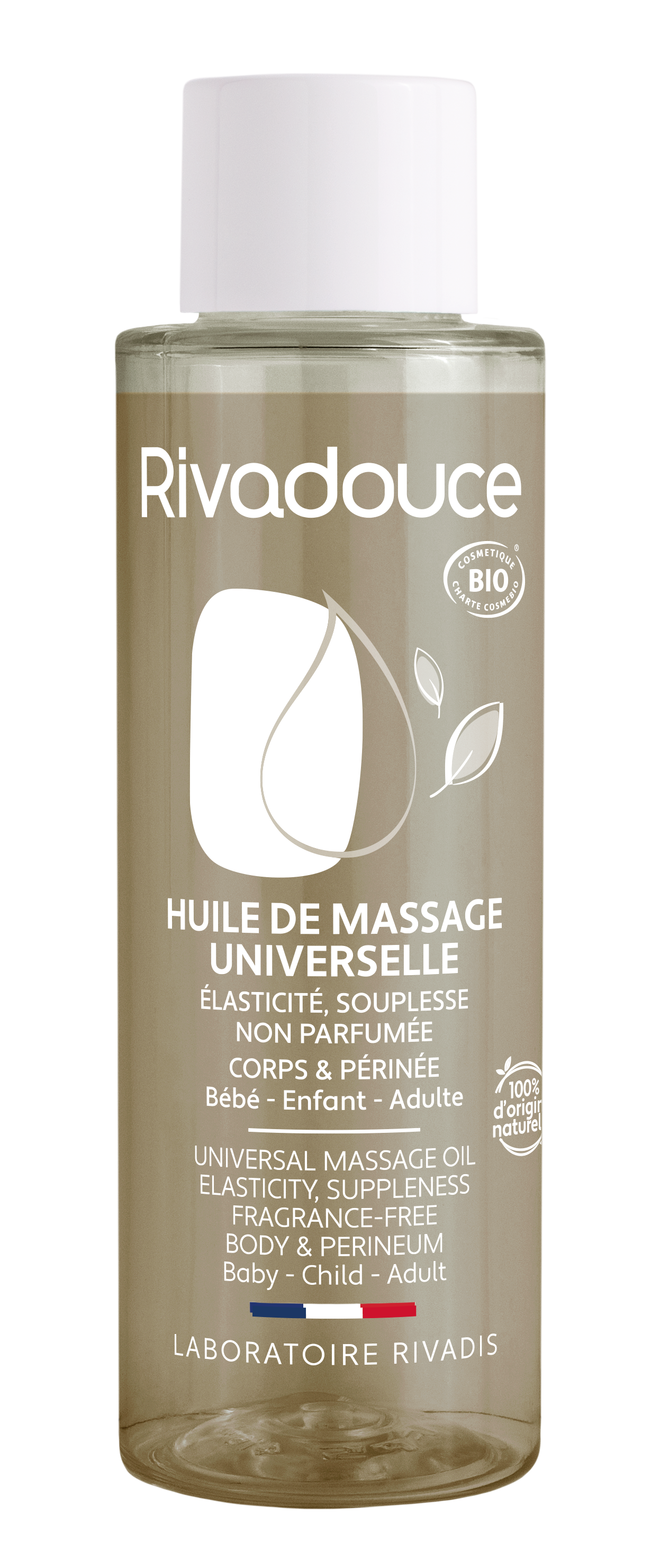L'Huile de massage universelle Rivadouce® certifiée Bio convient aux bébés, enfants et adultes. Elle est adaptée aux peaux sensibles pour un massage du corps ou du périnée. Formulée avec 100% d’ingrédients d’origine naturelle, elle hydrate et nourrit la peau, lui redonne élasticité et souplesse et pénètre rapidement.