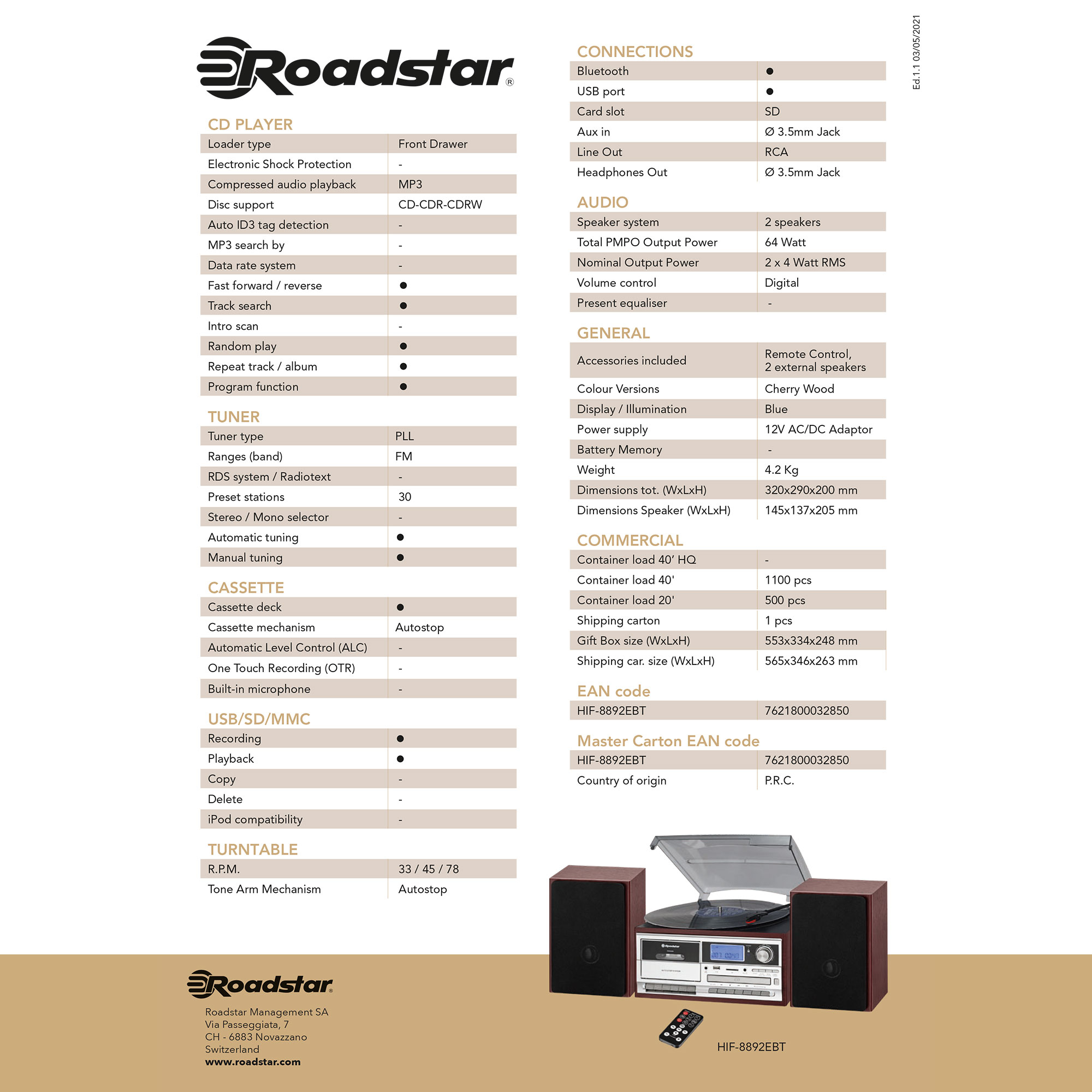 Roadstar HIF-8892EBT. Couleur du produit: Cherry (fruit), Argent, Bois, Nombre de platines: 1 platine(s), Nombre de disques optiques: 1 disques. Puissance évaluée de RMS: 8 W, Puissance de crête en sortie (PMPO): 64 W. Type de bandes supportées: FM, Type de tuner: Analogique, Bande FM: 87,5 - 108 MHz. Type d'écran: LCD, Couleur de Backlight: Bleu. Casque connection: 3,5 mm