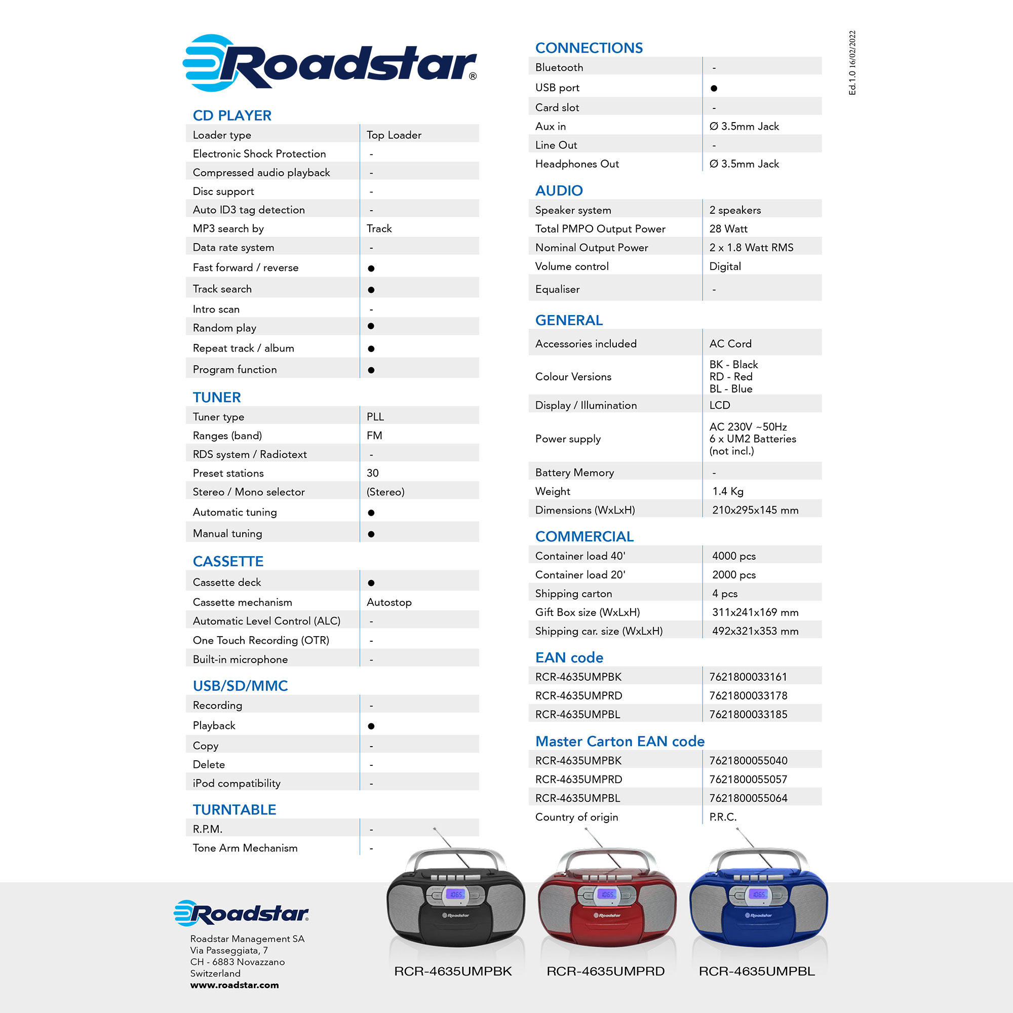 Roadstar RCR-4635 UMPBL. Type de tuner: Analogique, Type de bandes supportées: FM, PLL. Lecteur optique: Lecteur, Types de disque supportés: CD. Modes de lecture des cassettes: Auto stop. Puissance évaluée de RMS: 1,8 W. Couleur du produit: Bleu, Type de commande: Boutons, Commande de volume: Boutons