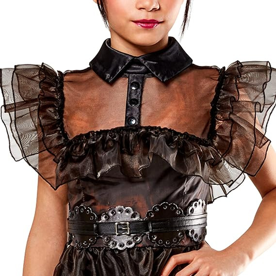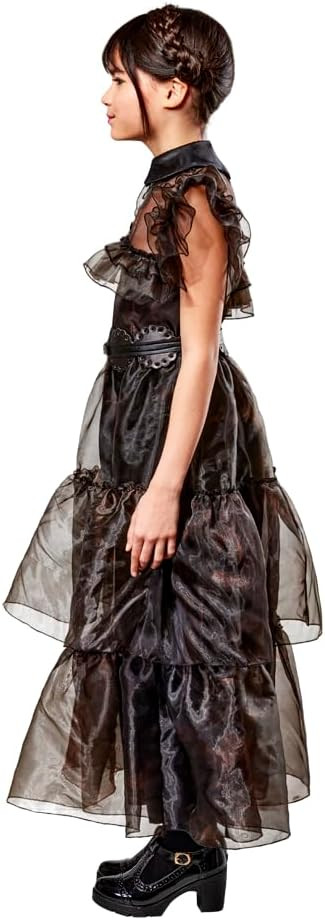 Une robe longue noire avec col chemise, encolure, épaules et jupon ornés de couches de tulle noir et ceinture.