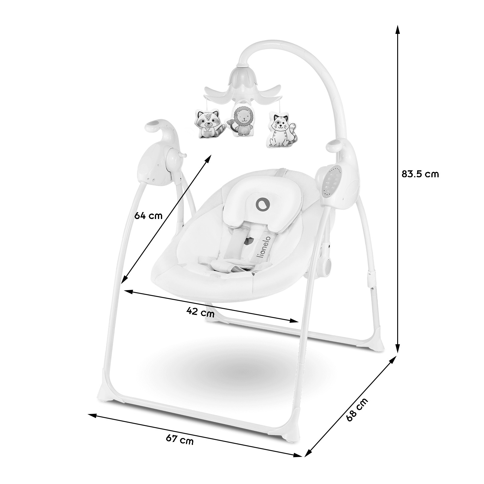 Balancelle motorisée ROBIN de la marque LIONELO. De 0 à 12 kg. Plusieurs couleurs disponibles. CARACTÉRISTIQUES : Conforme aux normes de sécurité EN 14988. La balancelle ROBIN se balance automatiquement grâce à son système de motorisation silencieux. La vitesse du balancement s'adapte en fonction du poids de l'enfant (peut être désactivé). La balancelle offre 12 mélodies et sons naturels. La balancelle fonctionne avec une alimentation électrique incluse ou avec 4 piles AA (non incluses). L'appui-tête de la balancelle est doux et rembourré. Le siège est inclinable sur 2 positions : position allongée (balancelle) ou semi-allongée (transat). La balancelle est pliable. L'arche de jeu est amovible (3 jouets inclus). La balancelle est équipée de 7 LED lumineuses. Un panneau de contrôle manuel vous permet de gérer les fonctions de la balancelle (activer le balancement pendant 8, 15 ou 30 minutes, régler la vitesse, activer la musique, arche jeu, etc...). La balancelle dispose d'un harnais de sécurité réglable à 5 points, d'un pied antidérapant et d'une moustiquaire amovible. DIMENSIONS ET POIDS : Dimensions : L. 67 X P. 68 X H. 83,5 cm. Poids : 4,6 kg MATIÈRES : Revêtement : 75% coton, 25% polyester. Structure en aluminium. A NOTER : pas de livraison en Corse ou sur les îles.
