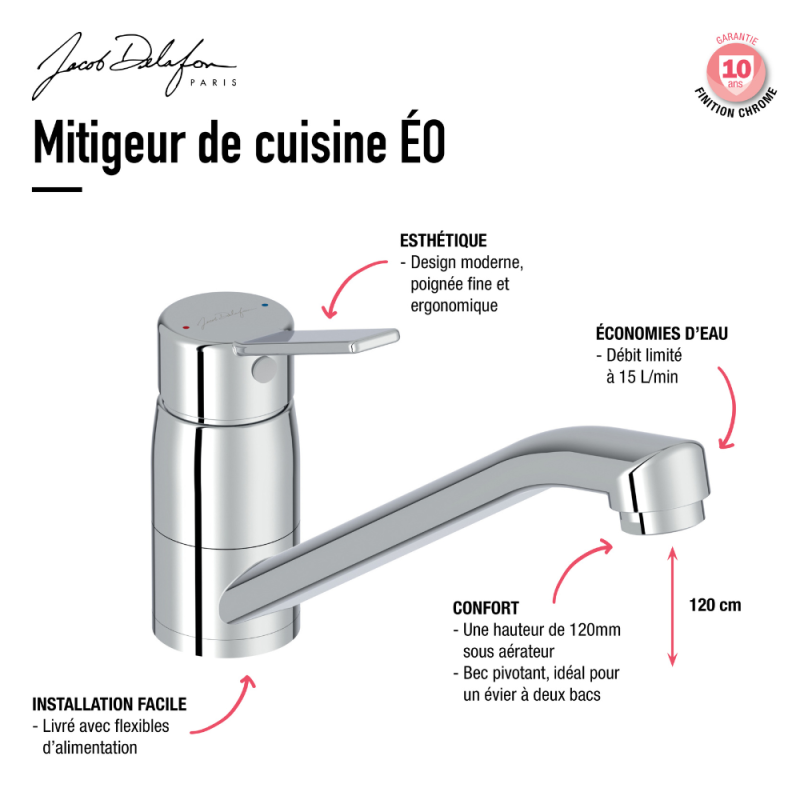 Caractéristiques Techniques Robinet cuisine JACOB DELAFON Eo chromé :