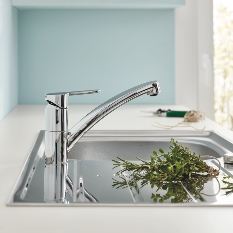 Avantages du mitigeur de cuisine GROHE StartEco bec bas . GROHE StarLight chromé éclatant et durable