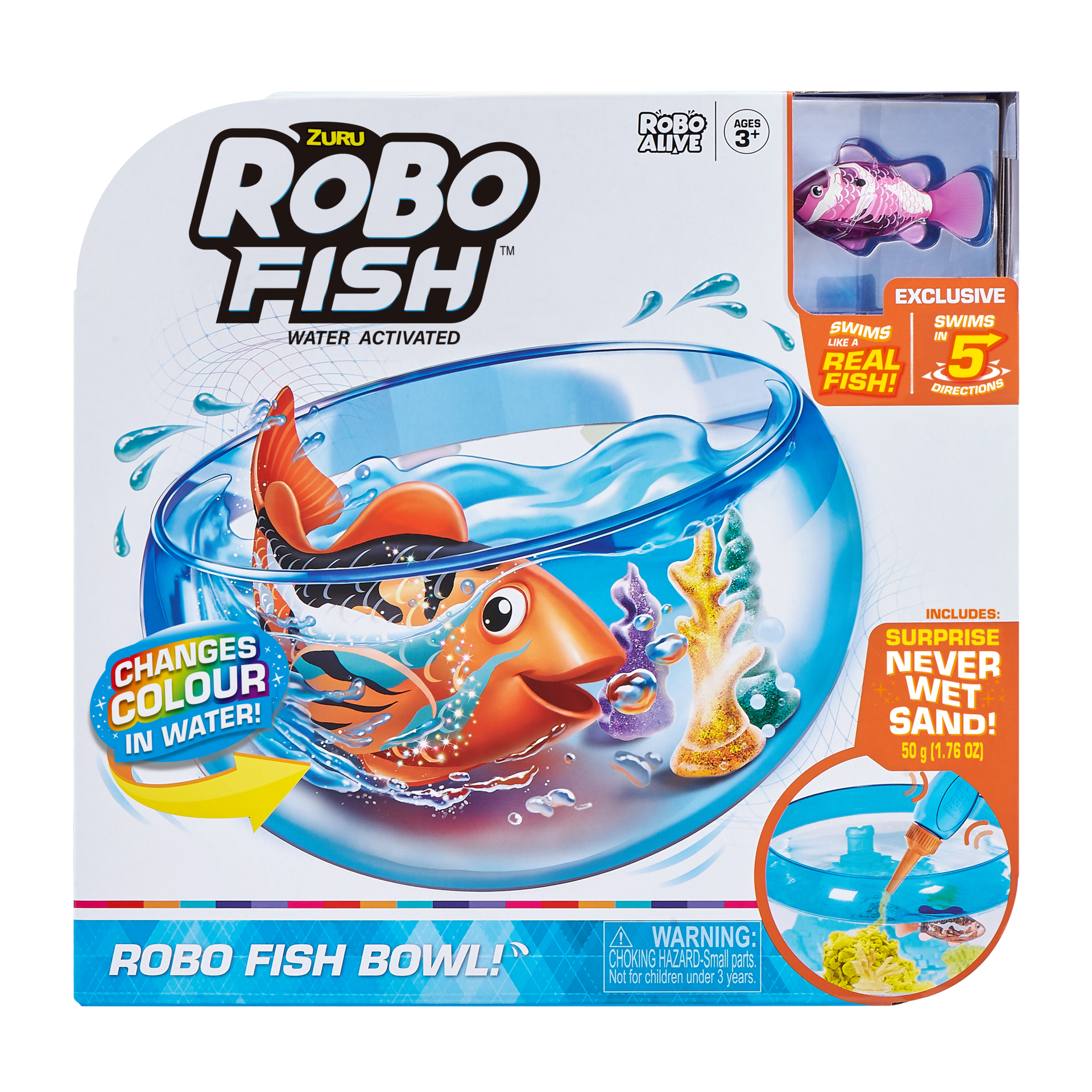 Donne vie à tes poissons Robo Fish, en les plongeant dans l'eau de ton aquarium. Il s'active au contact de l'eau et nage dans 5 directions, et change de couleur. Ce pack comprend l'aquarium, un poisson et du sable humide.