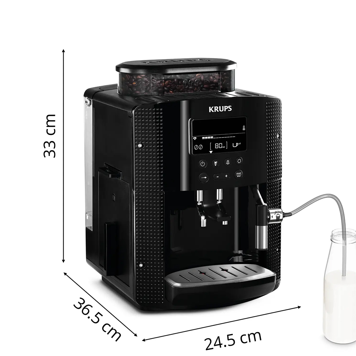 Conçue pour produire chez vous le café et l'espresso les plus purs et les plus puissants qui soient en toute simplicité, KRUPS Essential est une machine à café à grain automatique compacte aux standards de qualité. Dégustez de délicieux espressos et un capuccino d'exception chez vous. La machine à café broyeur grain automatique Essential de KRUPS vous offre un large choix de fonctionnalités. Grâce à son interface intuitive, le contrôle précis s'offre à vous, avec trois niveaux de température et trois finesses de broyage des grains de café pour des boissons sur mesure. KRUPS Essential vous apporte l'essence même de l'espresso, directement dans votre tasse. Un accessoire lait est inclus, pour préparer vos boissons lactées onctueuses en toute simplicité. Votre machine s'accompagne d'un paquet de 450gr de café en grain et de 2 tasses Espresso