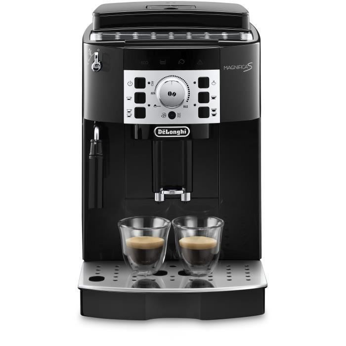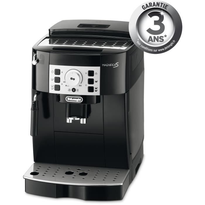 ecam22140b - robot café 15 bars noir - Robot café Magnificas DeLonghi ECAM22140B. Personnaliser son café n?a jamais été aussi facile. Choix de serré à long, d?extra léger à extra fort et de la température (basse, moyenne, élevée). Système Cappuccino : Une buse spécifique pour réaliser un lait mousseux, un cappuccino crémeux ou un Latte macchiatto. Préparation de 2 cafés en même temps. Thermoblock : garantie d?une température constante. Couvercle saveur pour le réservoir à grains. Fonction économie d?énergie. Grille égouttoir amovible avec indicateur de niveau d?eau.SIMPLE D?UTILISATION : Son panneau de commande vous permet de préparer simplement votre café en appuyant un bouton. La rotation du bouton augmente ou diminue l'intensité de l?arôme café. Deux cafés peuvent être préparés en une seule infusion.SYSTEME CAPPUCCINO : Le système Cappuccino vous permet de réaliser une mousse crémeuse pour de parfaits Cappuccino.RESERVOIR AMOVIBLE : Un réservoir amovible et accessible en façade pour une utilisation aisée.