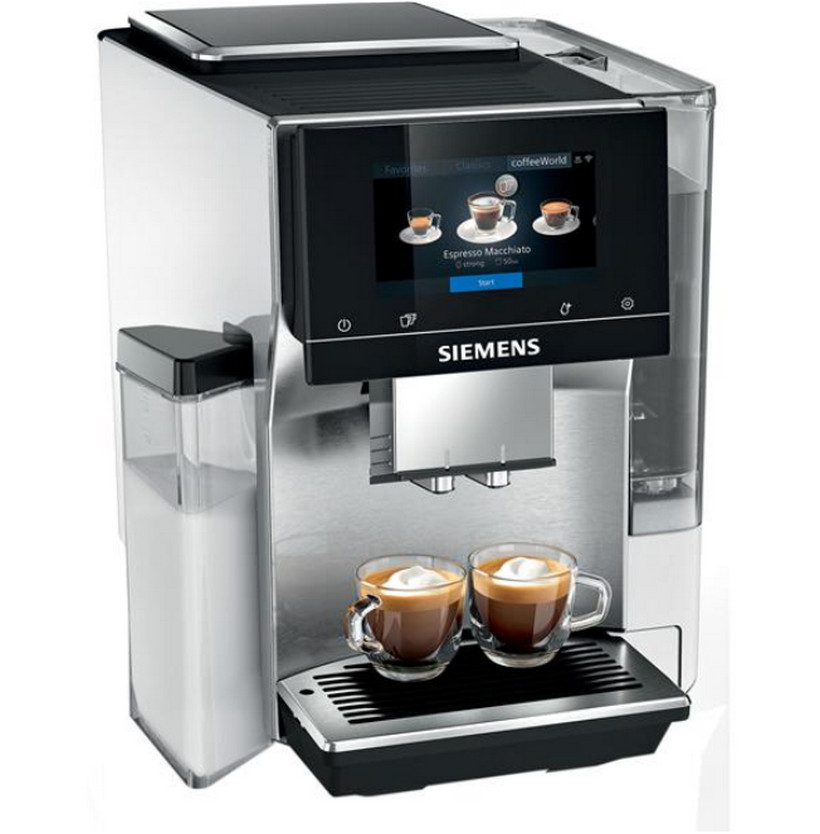 TQ705R03 - Robot café 19 bars inox - Le robot café EQ.700 Siemens TQ705R03 est un Expresso connecté avec broyeur à grains entièrement automatique. Découvrez un écran 100 % tactile qui se manipule comme un smartphone et ses 29 recettes de café différentes (dans l'appareil et l'application Home Connect). Toutes les boissons sont préparées automatiquement en un seul geste, même pour deux tasses en même temps. Multi-boissons avec possibilité de préparer deux boissons simultanément, en une seule touche. Cette machine à café tout-automatique possède un broyeur de haute qualité en céramique qui assure un broyage optimal du grain et une préparation très silencieuse. La technologie Intelligent Strength Adjustement permet une gestion adaptative de la quantité de café en fonction de la force et du volume d'eau choisit. Jusqu'à 20 boissons personnalisables. Rapidité de préchauffage d'eau : la première tasse est disponible en 40 secondes. Bac à grain 350 g avec couvercle teinté avec joint silicone pour préserver les grains de la lumière et de l'humidité. Trappe séparée pour le café moulu. Carafe à lait intégrée 0.7 L : facilement amovible pour le stocker dans la porte du réfrigérateur. Fonction AromaDoubleShot : double la quantité de café avec la même quantité d'eau, percolation en 2 temps pour un café serré sans goût amer. Nettoyage automatique des tuyaux de lait après chaque préparation. Rinçage automatique au démarrage et à l'arrêt de la machine. Programme Calc'n Clean : Indication du nombre de boissons restantes avant que l'appareil ne soit programmé pour être nettoyé/détartré avec mention du temps d'immobilisation. Fourni avec un filtre à eau Brita Intenza pour des arômes garantis et une durée de vie de l'appareil plus longue.
