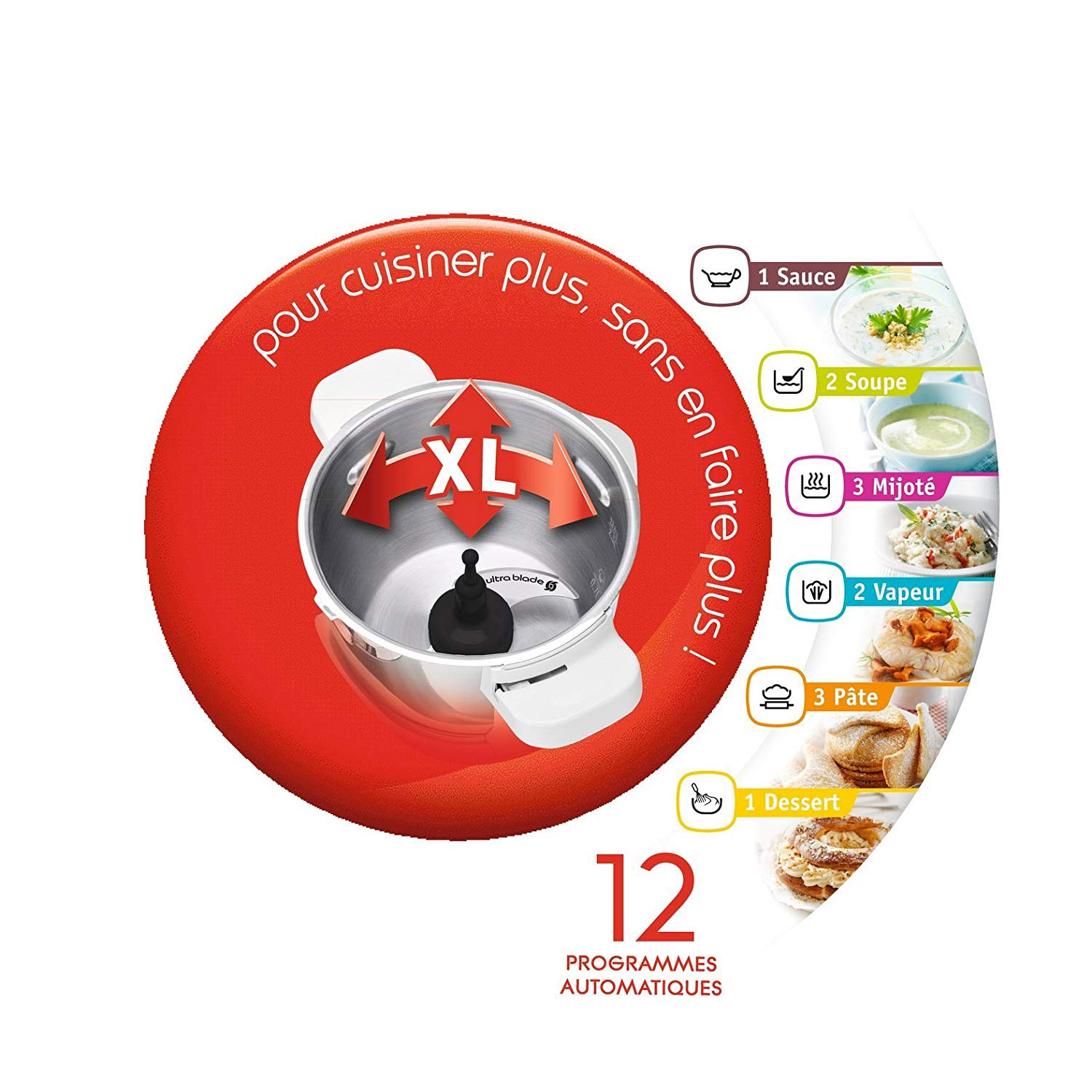 Puissance : 1550 W Panier vapeur : 2 L Pour cuire, mijoter, mélanger, pétrir et fouetter sans surveiller Bol XL : capacité jusqu'à 10 personnes Garantie 2 ans pièces et main-d'oeuvre