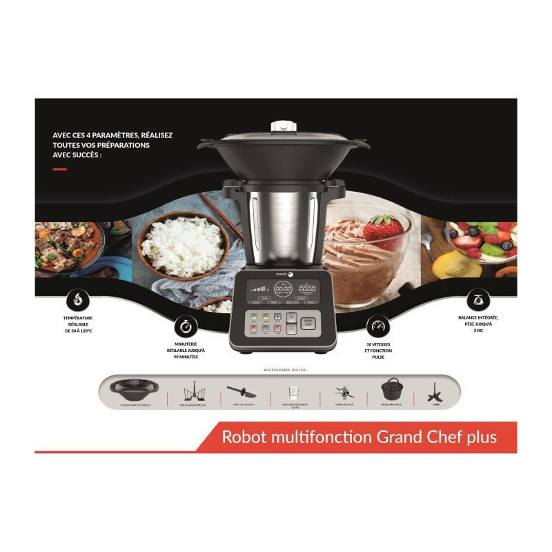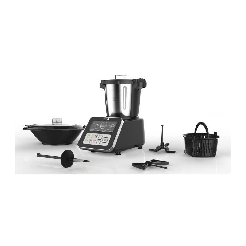 Livré avec 1 spatule, 1 lame hachoir, 1 protection lame pour mélange, 1 couvercle avec bouchon doseur 90 ml, 1 bol vapeur, 1 papillon et 1 panier.