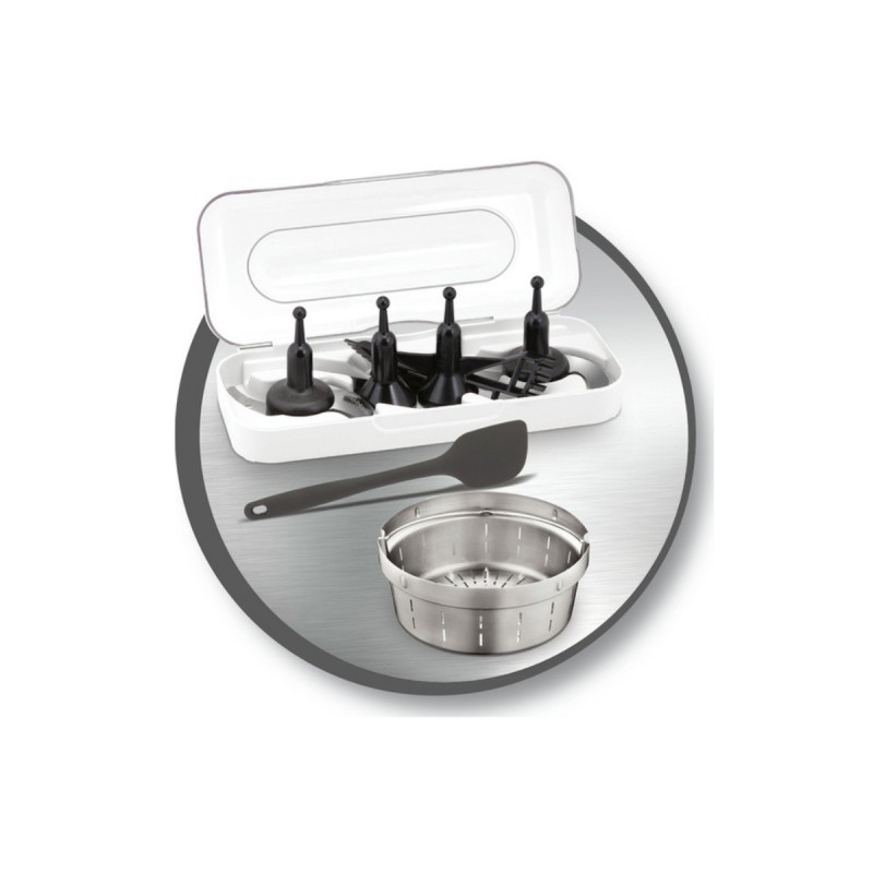 | Accessoires inclus | 1 couteau hachoir en inox, 1 couteau en inox pour pétrir et concasser, 1 batteur, 1 mélangeur, 1 panier vapeur en inox, spatule |