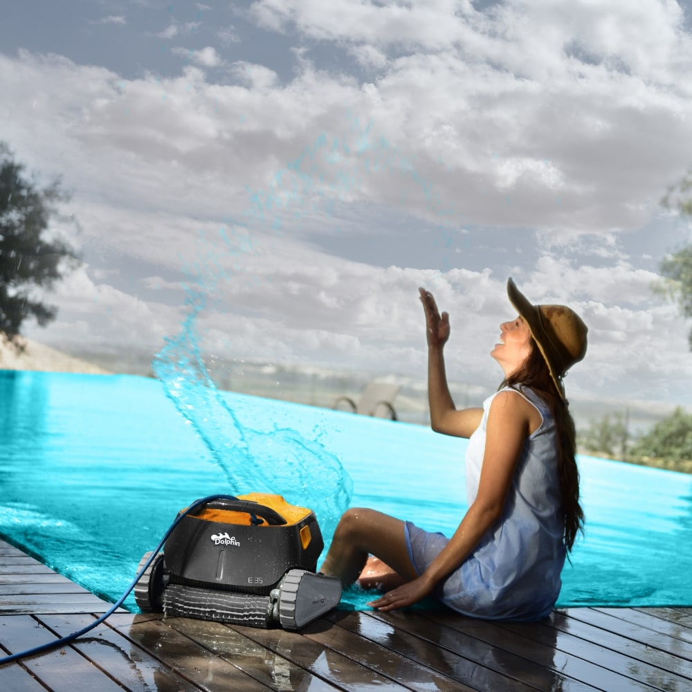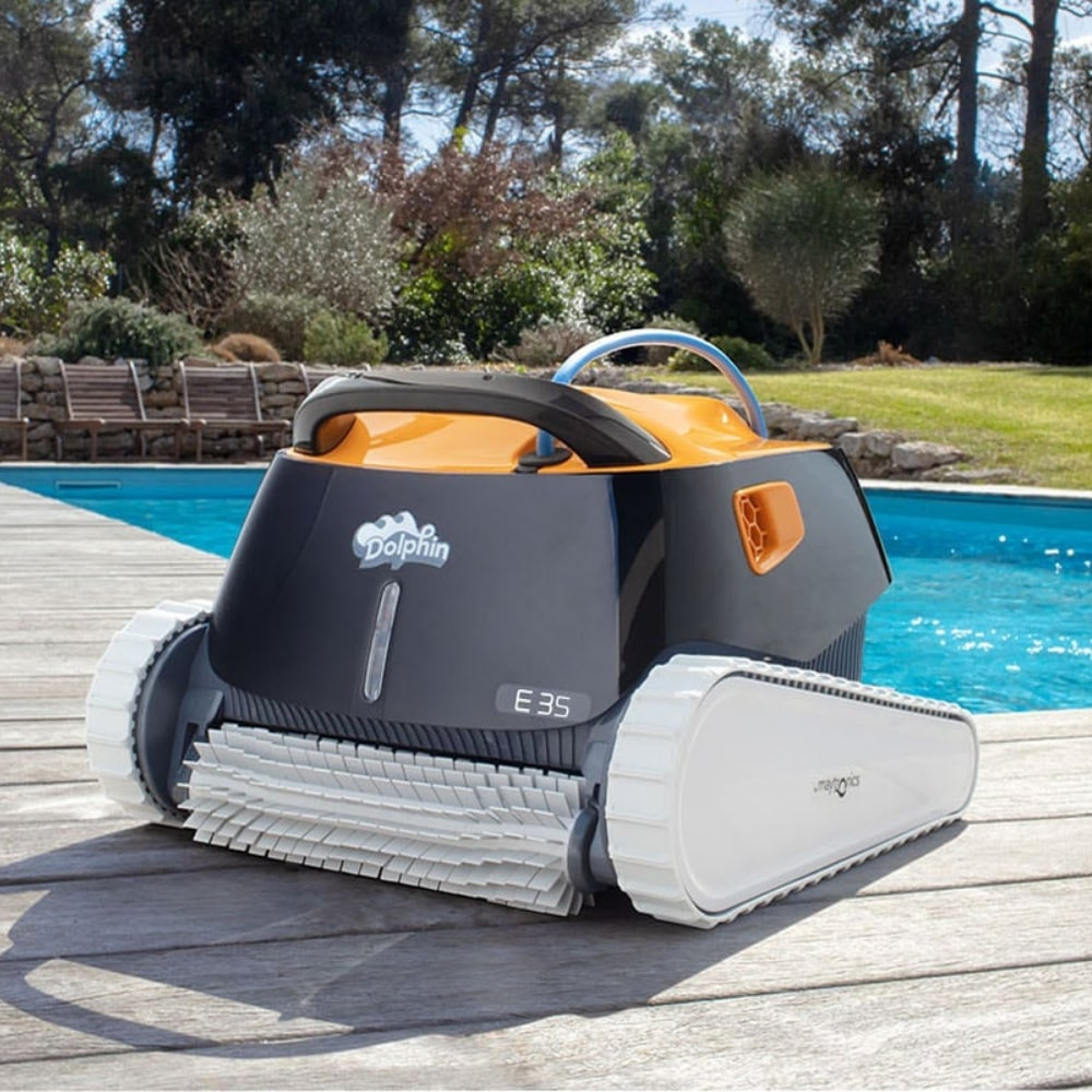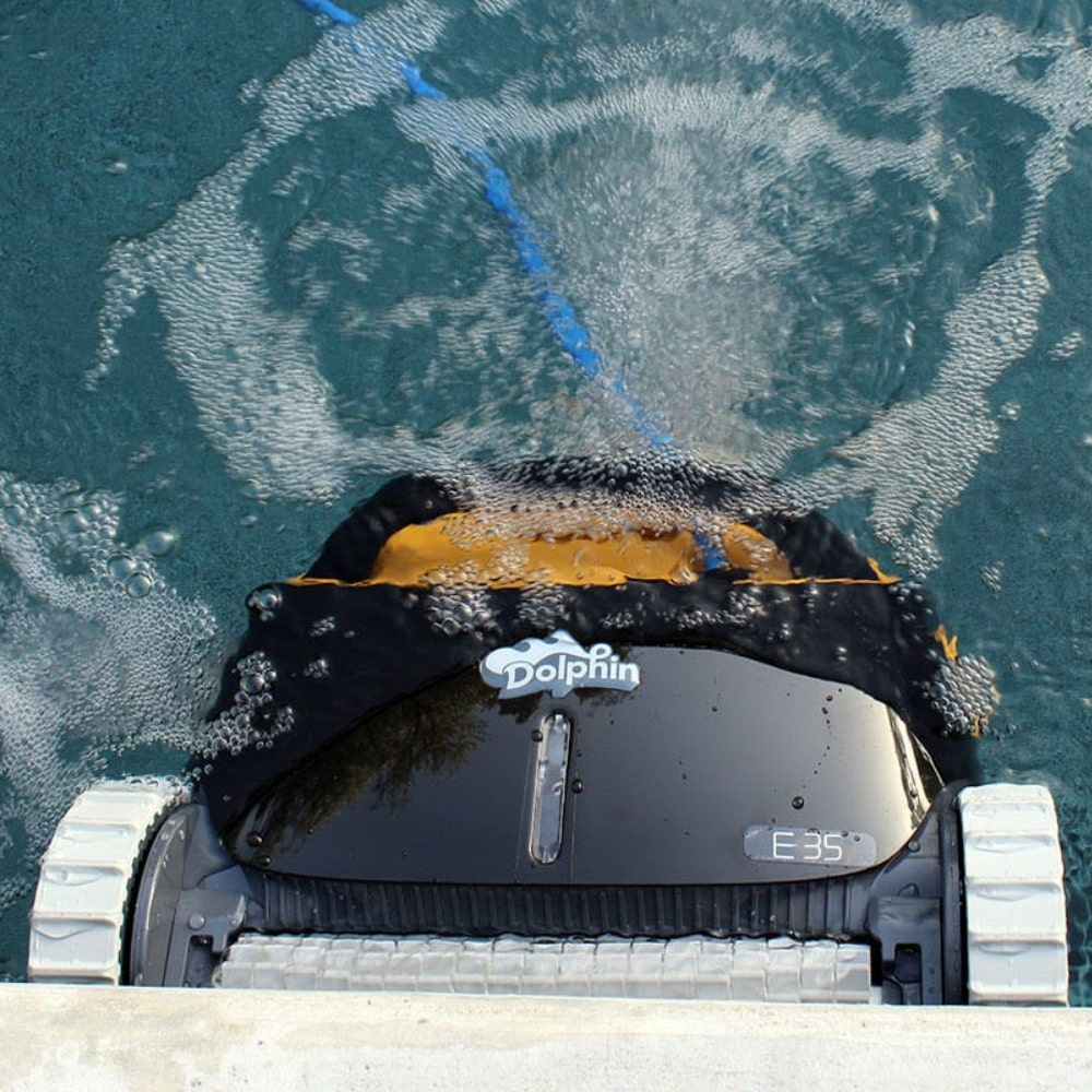 e35 - robot electrique de piscine fond, parois et ligne d'eau avec chariot - Offrez-vous un nettoyage ultra confort de votre piscine avec le robot de piscine électrique Dolphin E35 et ses fonctionnalités avancées ! Filtration multicouches, brossage actif, système de déplacement PowerStream? : le robot Dolphin E35 s'occupe de tout sans vous demander le moindre effort ! Le nettoyage de la piscine est performant et complet piscine (fond, parois et ligne d'eau) quel que soit le type de revêtement. Le robot Dolphin E35 offre un grand confort d?utilisation grâce à son poids ultra-léger et son évacuation rapide de l?eau.