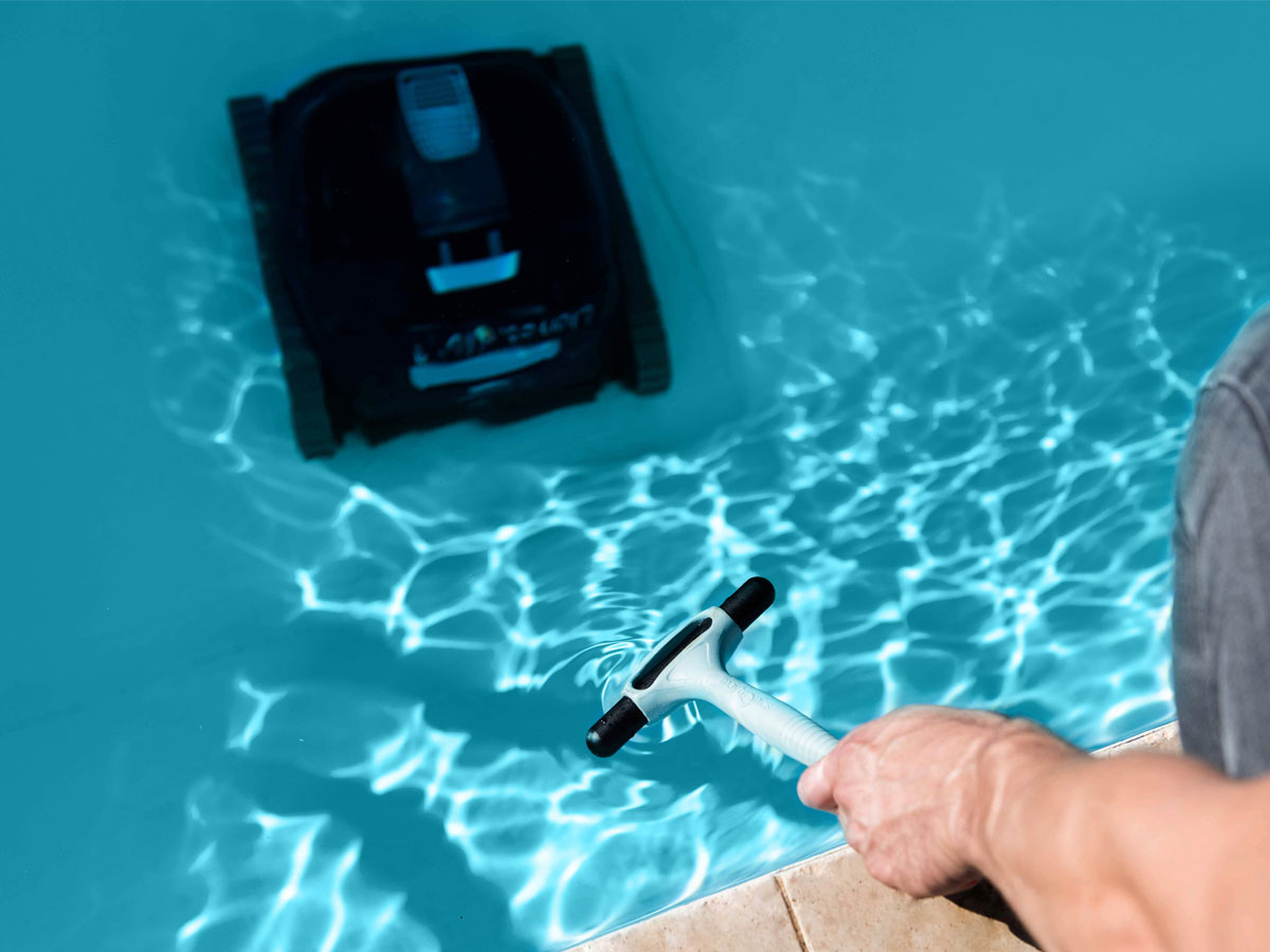Fourni avec un crochet de récupération : en fin de cycle, le robot s'arrête toujours près d'une paroi de la piscine, à portée du crochet, pour une sortie de l'eau facile