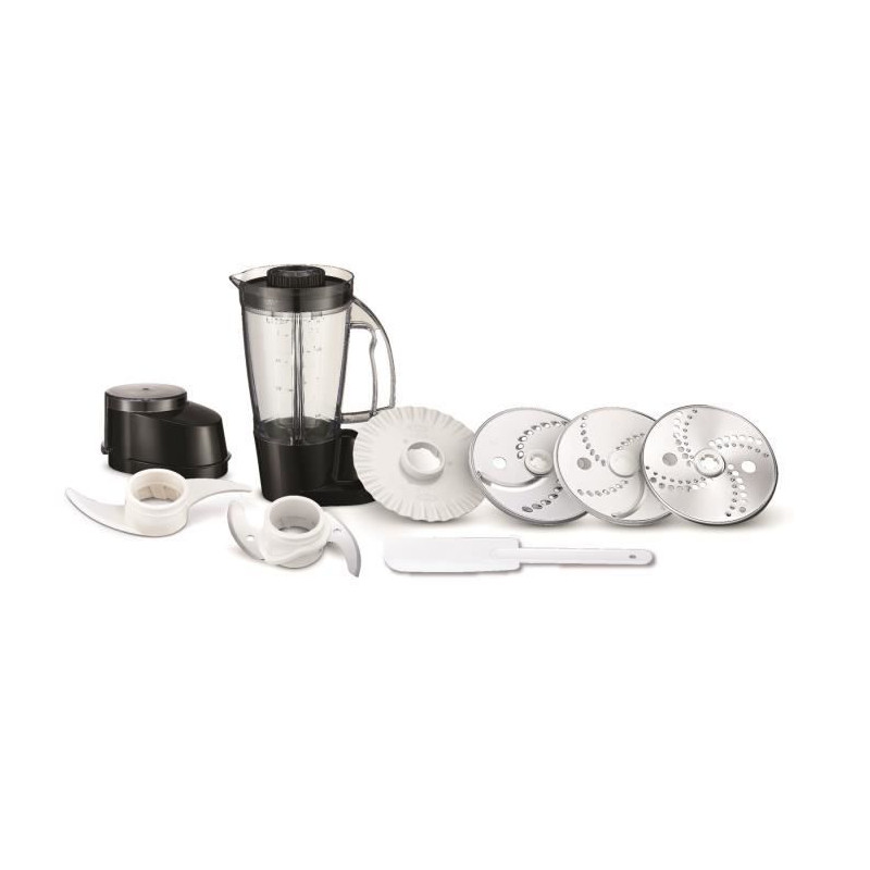 Accessoires inclus : 1 lame en inox, 3 disques réversibles en inox, 1 bol blender, 1 pétrin, 1 mini hachoir, 1 batteur et 1 spatule.