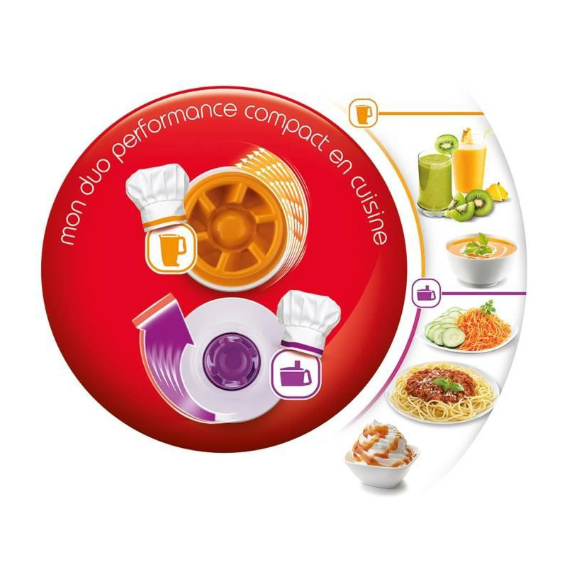 fp546811 - robot multifonctions 3l 800w avec blender noir - Robot multifonction Double Force Compact Moulinex FP546811. Mon duo performance en cuisine. Ce robot permet de réaliser tout type de préparation, quelle que soit la quantité, en ne prenant qu'une place limitée sur votre plan de travail. Multifonctions : râper, trancher, hacher, fouetter, pétrir et bien plus encore. Plus besoin de choisir entre vitesse et force ! Grâce à ses deux sorties moteur distinctes, il offre le meilleur des deux univers. Chaque sortie moteur fournit la vitesse et la force de rotation adaptées selon l'accessoire utilisé. En violet : optimisé pour l'utilisation du grand bol hachoir, fonctionne avec une vitesse réduite mais une puissante force de rotation. En orange : optimisé pour l'utilisation du bol blender. 6 vitesses au choix adaptés à chaque type de préparation: pour chaque sortie moteur, deux vitesses distinctes et une fonction Pulse sont disponibles grâce au bouton manuel. Équipé d'un ensemble complet d'accessoires : une lame en inox pour découper toutes sortes d'aliments, trois disques réversibles en inox pour trancher ou râper (ultra fin, fin et épais), gratter des légumes et fromages, un bol blender pour mixer de savoureux veloutés, jus, smoothies etc. Un pétrin pour préparer les pâtes, de la plus légère à la plus lourde. Un mini hachoir pour hacher finement oignons, ail, herbes, etc. Un batteur pour fouetter de la crème, réaliser des blancs en neige et émulsionner des sauces comme la mayonnaise.