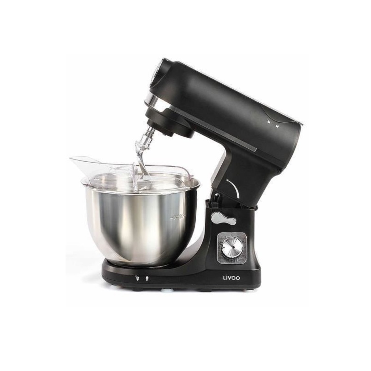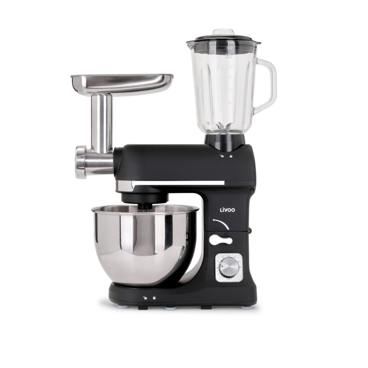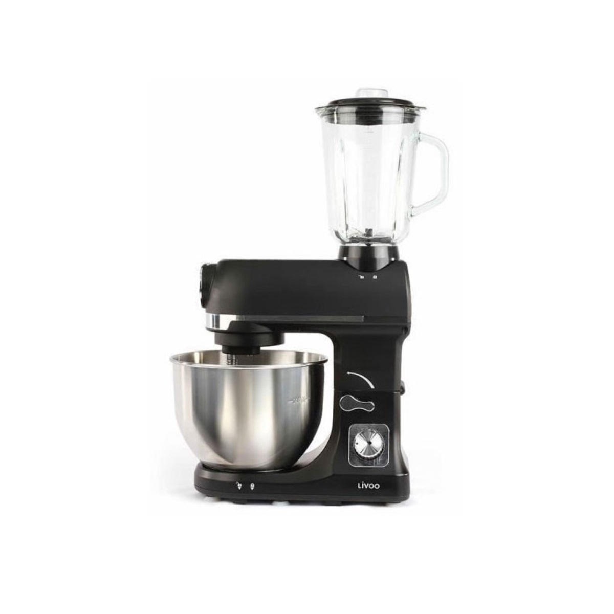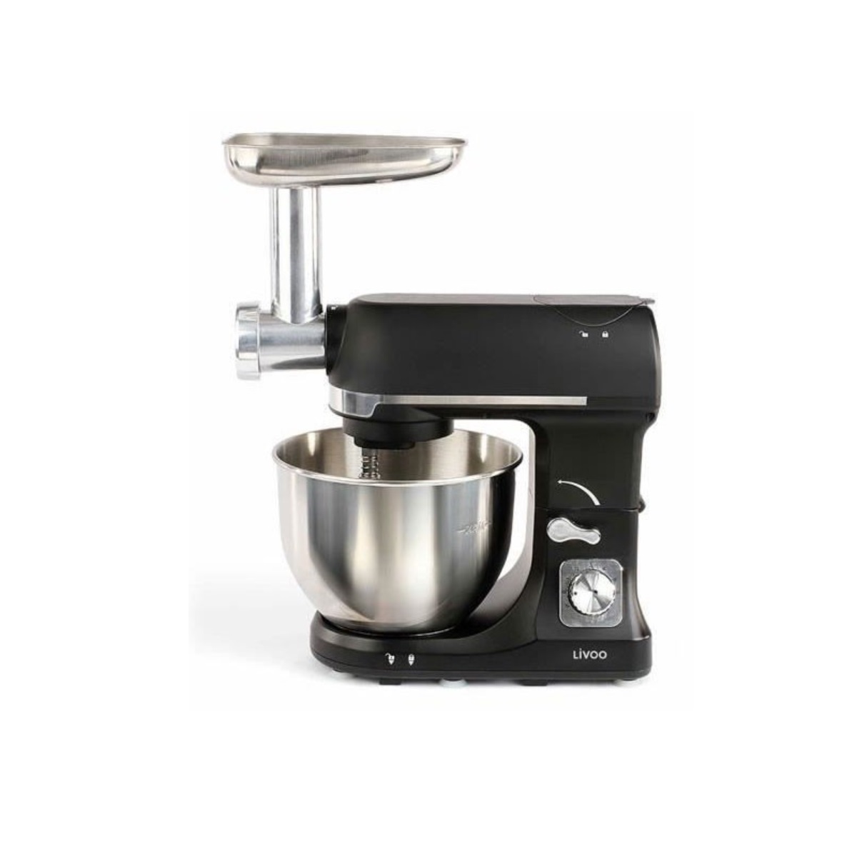 DOP189N - robot pâtissier 5l 1000w noir - Le Robot pâtissier DOP189N de LIVOO est un appareil très polyvalent ! Le moteur de 1000 Watts offre suffisamment de puissance pour permettre une utilisation polyvalente. Multifonction, le robot dispose d'un hachoir à viande, d'un entonnoir à saucisses, et de 3 disques à pâtes pour réaliser différentes sortes de pâtes. Il est également pourvu d'un socle pouvant accueillir un blender en verre sur le dessus pour réaliser de délicieux smoothies ou mixer des ingrédients. Les 6 niveaux de vitesses et la fonction pulse permettent d'adapter la puissance délivrée aux différentes préparations pâtissières. Le robot effectue un mouvement planétaire (l'accessoire tourne sur lui-même tout en suivant les parois du bol) ce qui permet d’obtenir des préparations homogènes. Son bol en inox d'une grande capacité de 5L peut accueillir un couvercle anti-éclaboussures pour plus de praticité. Le robot pâtissier dispose de 3 outils : 1 fouet pour fouetter, battre et aérer les préparations, 1 crochet pour pétrir et préparer des viennoiseries et pâtes à pain, 1 batteur feuille pour confectionner des pâtes à tartes, crèmes et sauces.