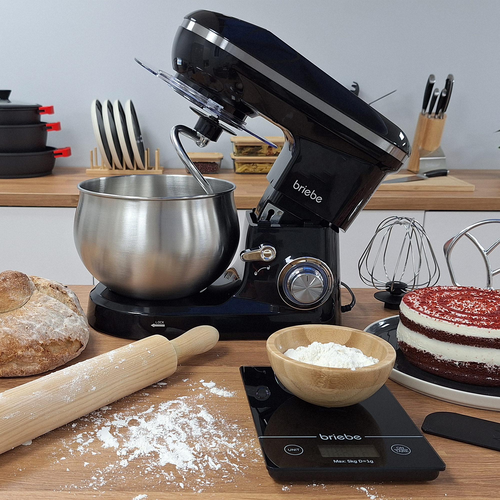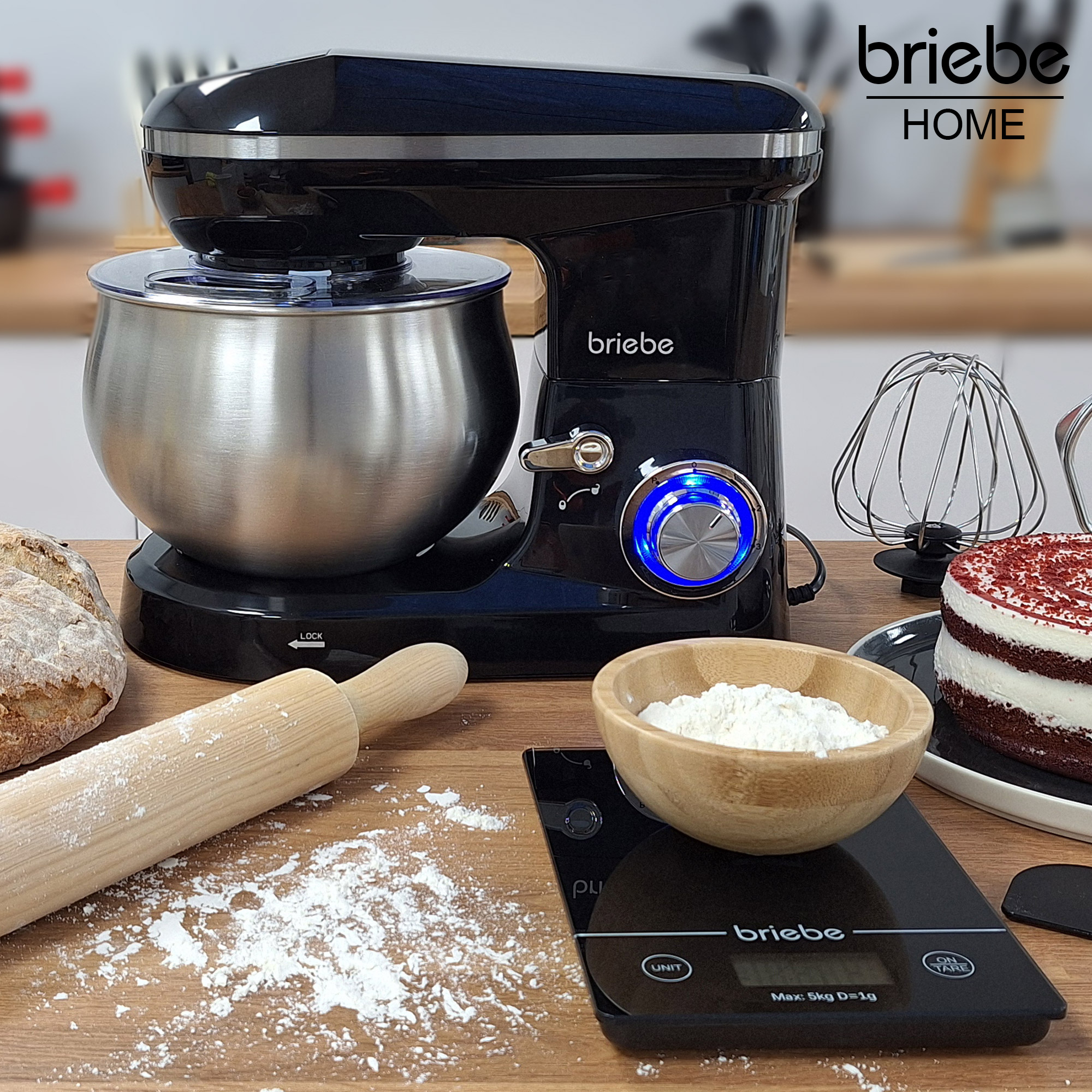 Robot Pâtissier, Bol Inox 5L 6 Vitesses Écran Tactile LED + Balance de Cuisine 1800 Noir BriebeKM1164B