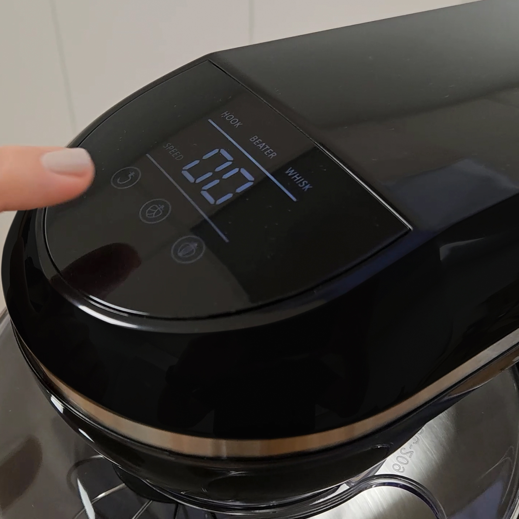 • Écran tactile LED : Il dispose d'un panneau de contrôle situé sur la tête de l'appareil. Il vous suffit de brancher la machine au secteur et de sélectionner sur le panneau l'icône de l'accessoire que vous allez utiliser. Elle commencera alors à fonctionner automatiquement à la vitesse appropriée. Pour arrêter, appuyez à nouveau sur l'icône. Si vous préférez, vous pouvez également sélectionner la vitesse manuellement à l'aide du sélecteur situé sur le côté du pétrin.