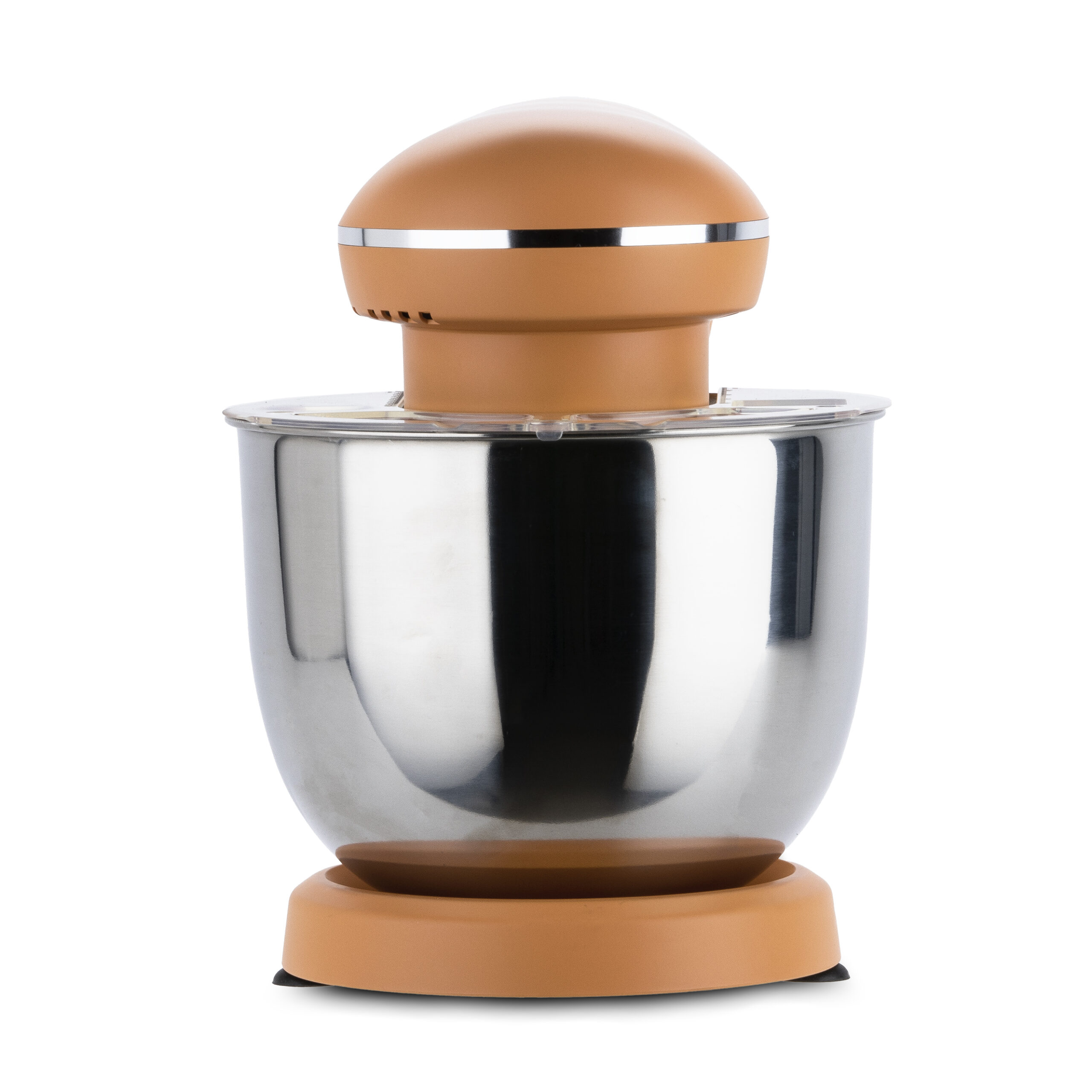 - Bol de qualité. Le bol en acier inoxydable robuste a une capacité de 5 litres, ce qui vous permet de travailler avec de plus grandes quantités de pâte ou de mélange sans les renverser.