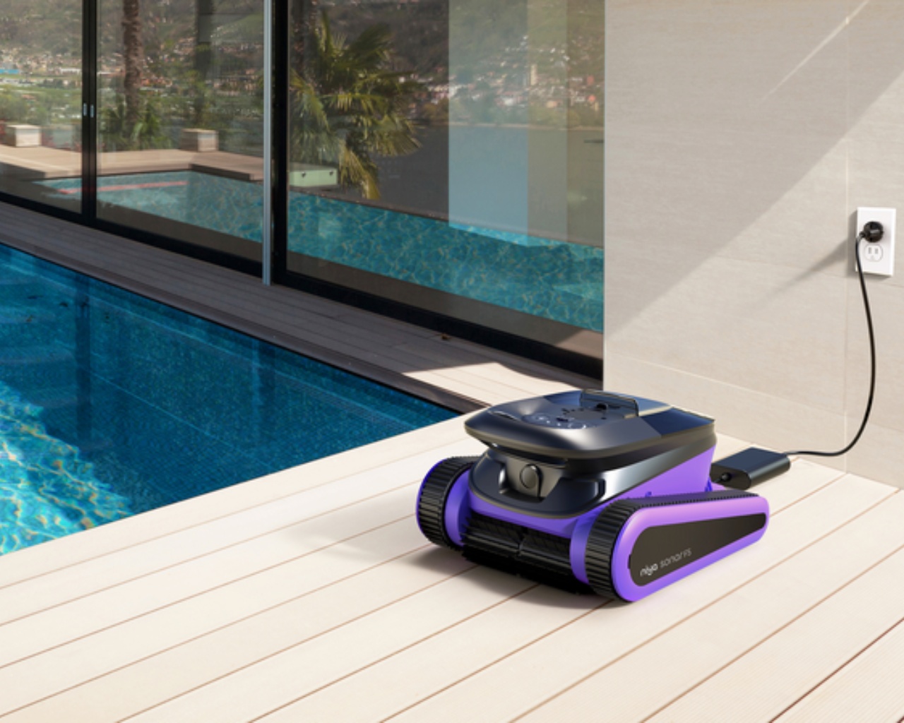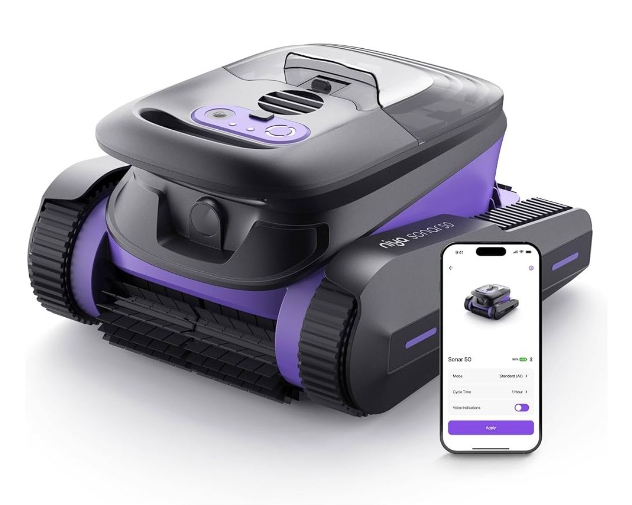 Robot de piscine sans fil Niya Sonar F5 (Sonar 50) : batterie lithium-ion 7800 mAh, autonomie jusqu'à 2h30, navigation intelligente par sonar, trois moteurs puissants, deux brosses actives, filtration 200 microns (3,2 L), nettoyage du fond, des...
