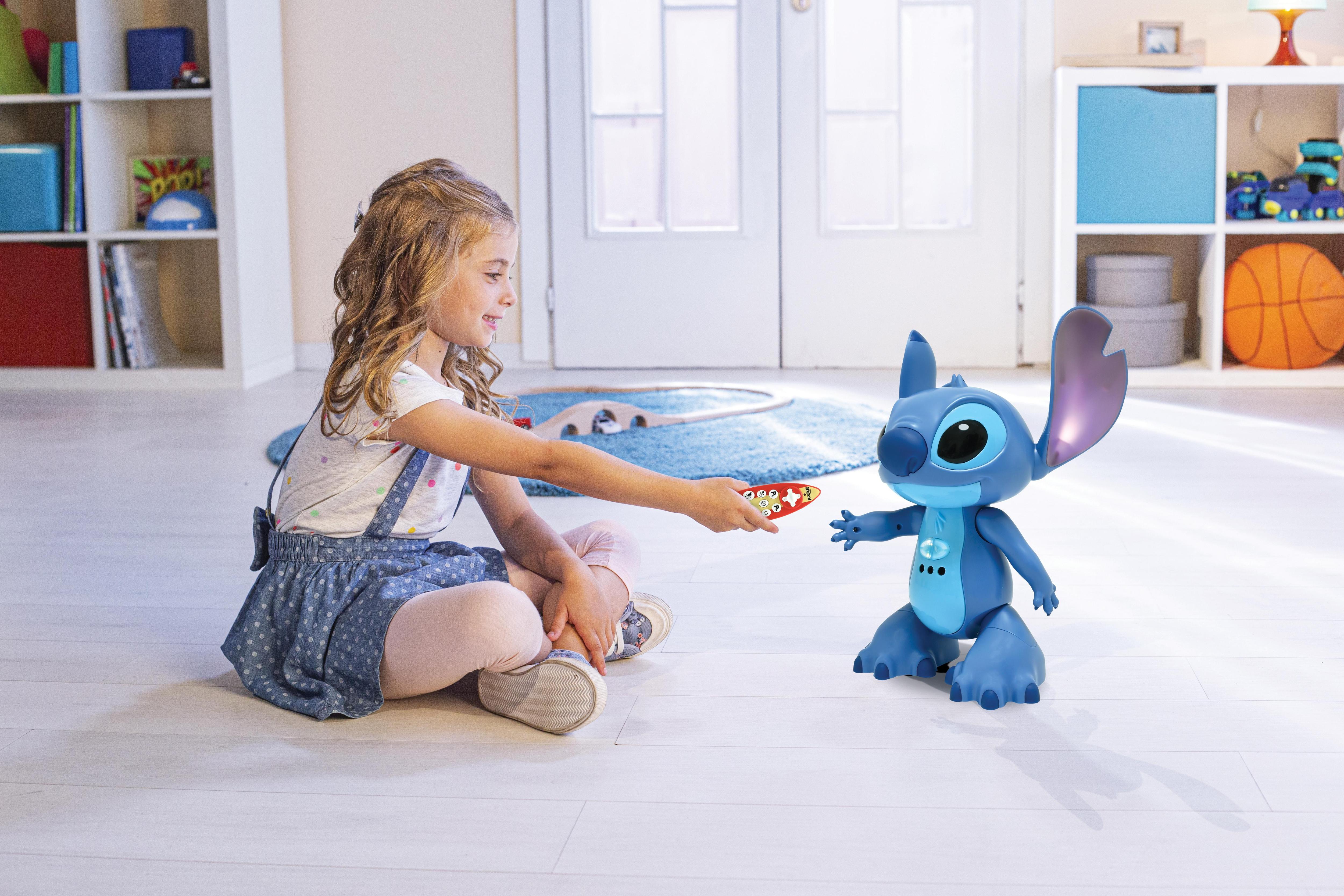 PARTEZ À L’AVENTURE AVEC VOTRE NOUVEAU MEILLEUR AMI STITCH POUR DES HEURES DE JEU ! - Contrôlez Stitch dans toutes les directions avec la télécommande en forme de surf ou avec votre main grâce au contrôle gestuel. Il se déplace à deux vitesses : marche et glisse ! - Programmable : Stitch vous montre ce qu’il peut faire et vous apprend la programmation ! - Testez vos connaissances avec un quiz sur l’univers de Stitch, raconté par Stitch lui-même ! - Mode histoires : Profitez de l’histoire de Stitch racontée par un narrateur à travers une série de mini-histoires ! - Dansez et chantez avec Stitch en choisissant parmi les mélodies incluses. - Sensible au toucher : caressez Stitch et regardez-le réagir avec des réponses délicieuses ! - Effets sonores amusants et sons surprises avec des effets lumineux inclus. Les yeux de Stitch s’illuminent !