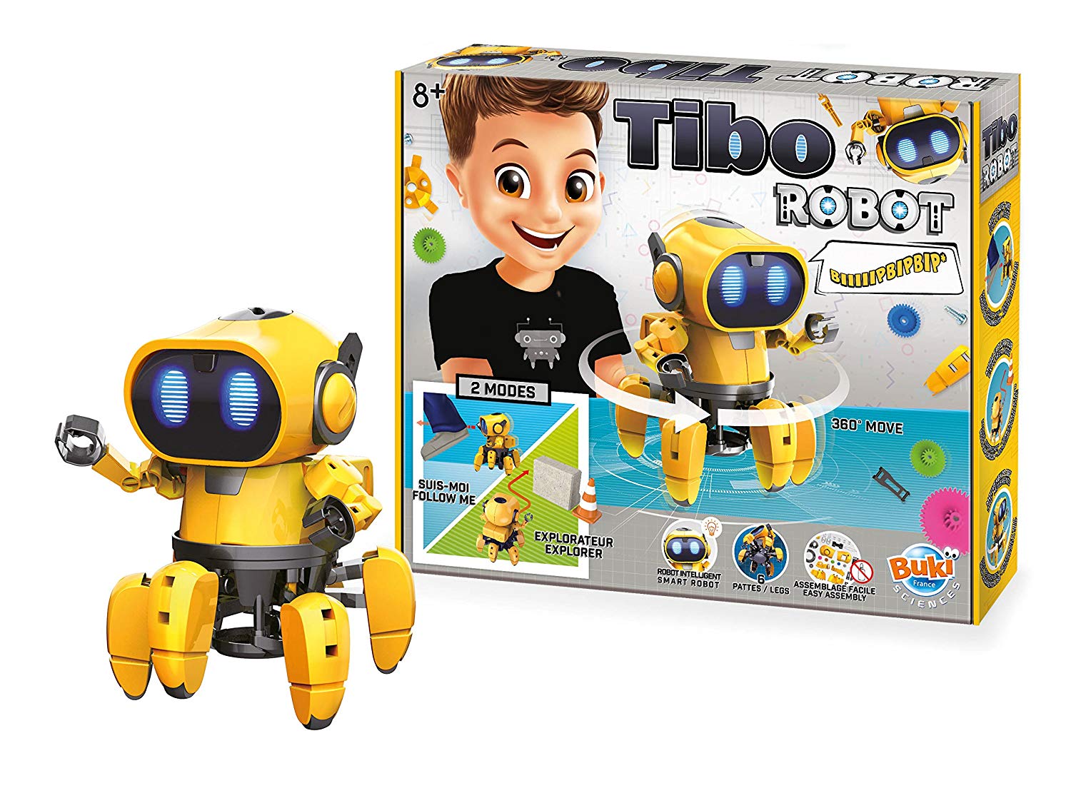Assemble Tibo le robot et découvre ses fonctions surprenantes : - Mode Suis-moi: grâce à ses capteurs, le robot détecte une présence et suis les pas de l’enfant. - Mode Explorateur: le robot se balade dans la pièce et évite les obstacles grâce à ses 6 pattes pour des mouvements à 360°. Notice illustrée en couleurs.
