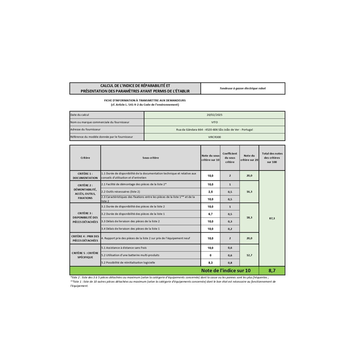Indice de réparabilité 8,7 / 10