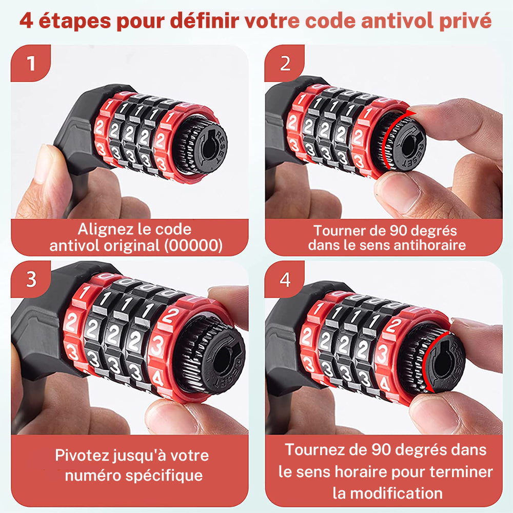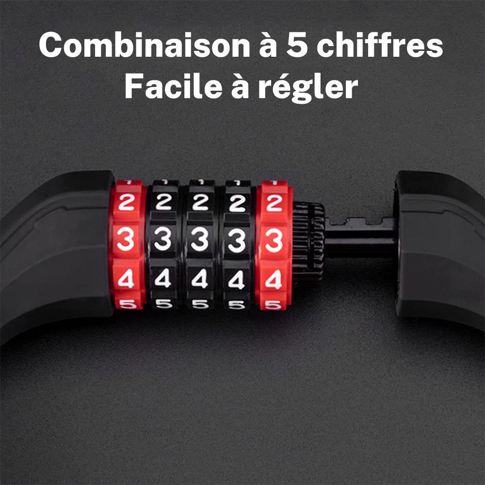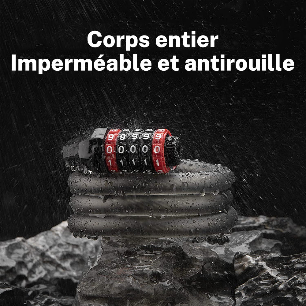 L'antivol pour vélo est composé d'une coque en PVC résistant aux coupures et de cinq câbles en acier haute résistance à l'intérieur. Il est très résistant à la coupure, robuste et résistant aux dommages.