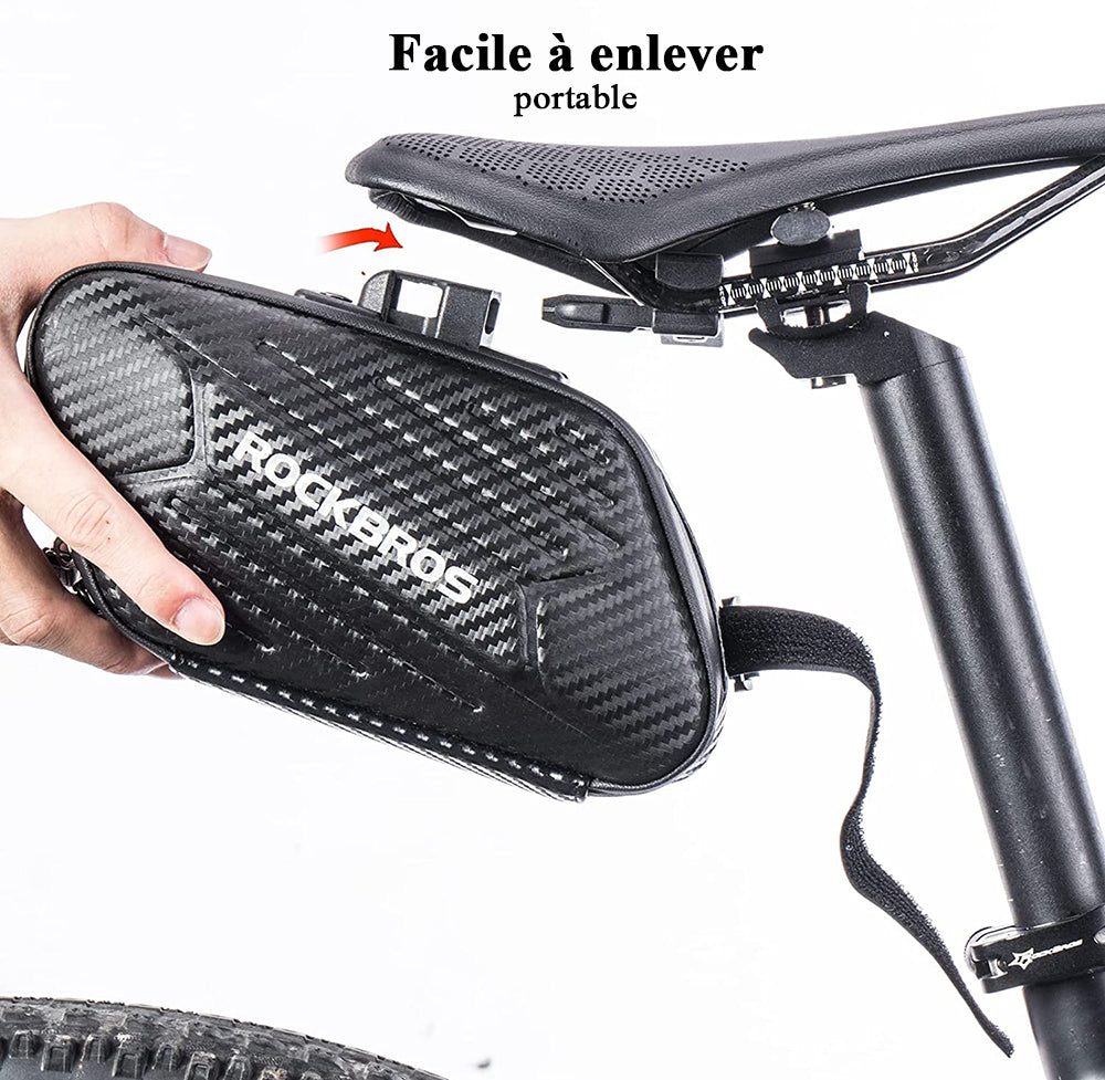 La sacoche est fixée sous le siège de vélo par le dispositif de dégagement rapide, et le sac est attaché au cadre du vélo avec la sangle collante. Il ne faut qu'une minute pour retirer le sac.