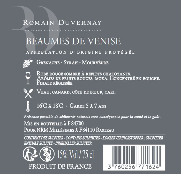 Beaumes de Venise est une appellation qui gagne en notoriété, cette cuvée produite par le maître vinificateur Romain Duvernay en est un bel exemple. Elle offre un nez aux arômes de fruits noirs associés à des notes épicées rappelant la garrigue, puis une texture en bouche dense et veloutée à la fois, suivie d’une longue finale chaleureuse. Un vin déjà excellent bien que doté d’un potentiel de garde d’au moins 3 ans, qui devrait s’accorder parfaitement avec des aubergines farcies d’agneau! A servir aux alentours des 15 degrés.
