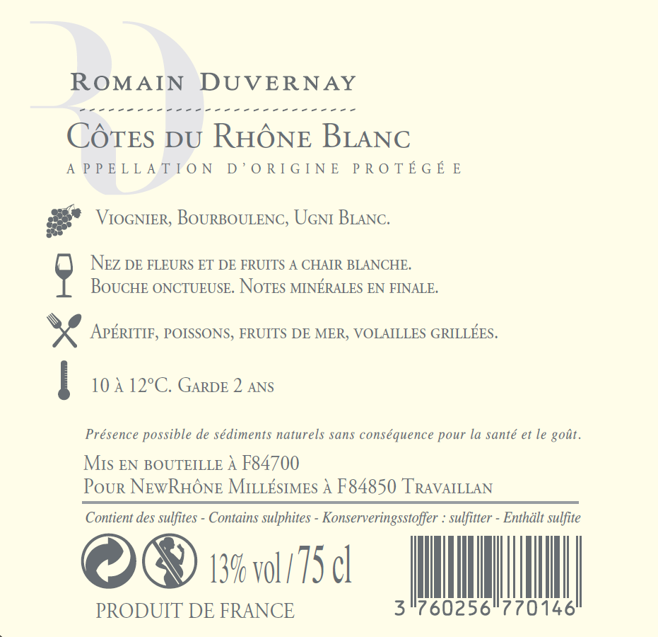 | Libellé | Romain Duvernay, 2024 - Côtes du Rhône AOP - Blanc Sec - 75 cl |