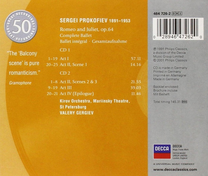 | Liste des pistes | 2.01 . act 2 scene 2 : romeo at friar laurence's - Serge Prokofiev2.02 . act 2 scene 2 : juliet at friar laurent - Serge Prokofiev2.03 . act 2 scene 3 : public merrymaking - Serge Prokofiev2.04 . act 2 scene 3 : further public festivities - Serge Prokofiev2.05 . act 2 scene 3 : tybalt meets mercutio - Serge Prokofiev2.06 . act 2 scene 3 : tybalt and mercutio fight - Serge Prokofiev2.07 . act 2 scene 3 : mercutio dies - Serge Prokofiev2.08 . act 2 scene 3 : romeo resolves to venge mercutio's death... - Serge Prokofiev2.09 . act 3 : introduction/act 3 scene 1 : romeo and juliet - Serge Prokofiev2.10 . act 3 scene 1 : the last farewell - Serge Prokofiev2.11 . act 3 scene 1 : the nurse - Serge Prokofiev2.12 . act 3 scene 1 : juliet refuses to marry paris - Serge Prokofiev2.13 . act 3 scene 1 : juliet alone... - Serge Prokofiev2.14 . act 3 scene 2 : at friar laurence's cell/interlude - Serge Prokofiev2.15 . act 3 scene 3 : juliet's room - Serge Prokofiev2.16 . act 3 scene 3 : juliet alone - Serge Prokofiev2.17 . act 3 scene 3 : morning serenade - Serge Prokofiev2.18 . act 3 scene 3 : dance of the girls with lilies - Serge Prokofiev2.19 . act 3 scene 3 : at juliet's bedside - Serge Prokofiev2.20 . act 4 (epilogue) : juliet's funeral - Serge Prokofiev2.21 . act 4 (epilogue) : juliet's death - Serge Prokofiev1.01 . introduction - Serge Prokofiev1.02 . act 1 scene 1 : romeo - Serge Prokofiev1.03 . act 1 scene 1 : the street awakens - Serge Prokofiev1.04 . act 1 scene 1 : morning dance - Serge Prokofiev1.05 . act 1 scene 1 : the quarrel - Serge Prokofiev1.06 . act 1 scene 1 : the fight/the prince gives his order - Serge Prokofiev1.07 . act 1 scene 1 : interlude - Serge Prokofiev1.08 . act 1 scene 2 : preparations for the ball - Serge Prokofiev1.09 . act 1 scene 2 : juliet as a young girl - Serge Prokofiev1.10 . act 1 scene 2 : arrival of th eguests - Serge Prokofiev1.11 . act 1 scene 2 : masks - Serge Prokofiev1.12 . act 1 scene 2 : dance of the knights - Serge Prokofiev1.13 . act 1 scene 2 : juliet's variation - Serge Prokofiev1.14 . act 1 scene 2 : mercutio - Serge Prokofiev1.15 . act 1 scene 2 : madrigal - Serge Prokofiev1.16 . act 1 scene 2 : tybalt recognises romeo - Serge Prokofiev1.17 . act 1 scene 2 : the departure of the guests - Serge Prokofiev1.18 . act 1 scene 2 : balcony scene - Serge Prokofiev1.19 . act 1 scene 2 : romeo's variation... - Serge Prokofiev1.20 . act 2 scene 1 : folk dance - Serge Prokofiev1.21 . act 2 scene 1 : romeo and mercutio - Serge Prokofiev1.22 . act 2 scene 1 : dance of the five couples - Serge Prokofiev1.23 . act 2 scene 1 : dance with mandolins - Serge Prokofiev1.24 . act 2 scene 1 : the nurse - Serge Prokofiev1.25 . act 2 scene 1 : the nurse delivers juliet's message to romeo - Serge Prokofiev |