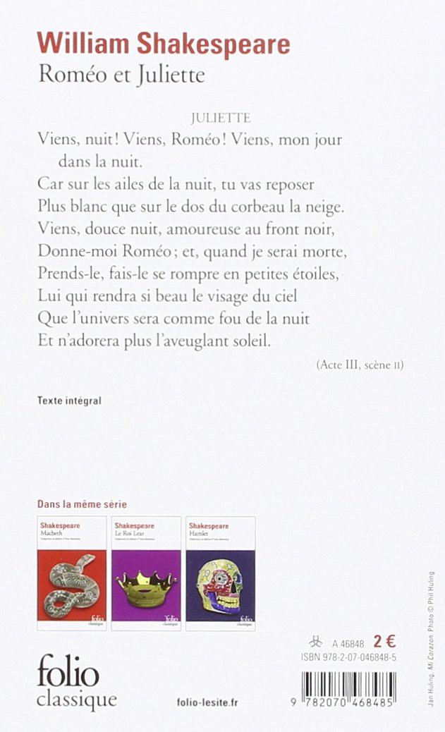 JULIETTE Viens, nuit ! Viens, Roméo ! Viens, mon jour dans la nuit. Car sur les ailes de la nuit, tu vas reposer Plus blanc que sur le dos du corbeau la neige, Viens, douce nuit, amoureuse au front noir, Donne-moi Roméo ; et, quand je serai morte, Prends-le, fais-le se rompre en petites étoiles, Lui qui rendra si beau le visage du ciel Que l'univers sera comme fou de la nuit Et n'adorera plus l'aveuglant soleil. (Acte III, scène II)