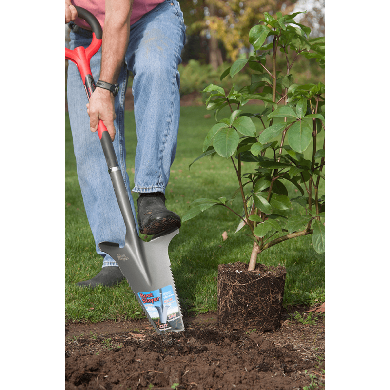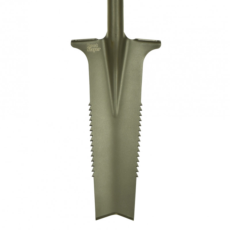 - RootSlayer : Conçu en acier carbone rien ne peut l'arrêter. Sa tête trapézoïdale et ses dents aiguisées et son manche à 360° degrés font de lui l'outil idéal ultime. Les bêches traditionnelles sont dépassées, leurs bords sont inconfortables et leurs manches se cassent aux moindres efforts.