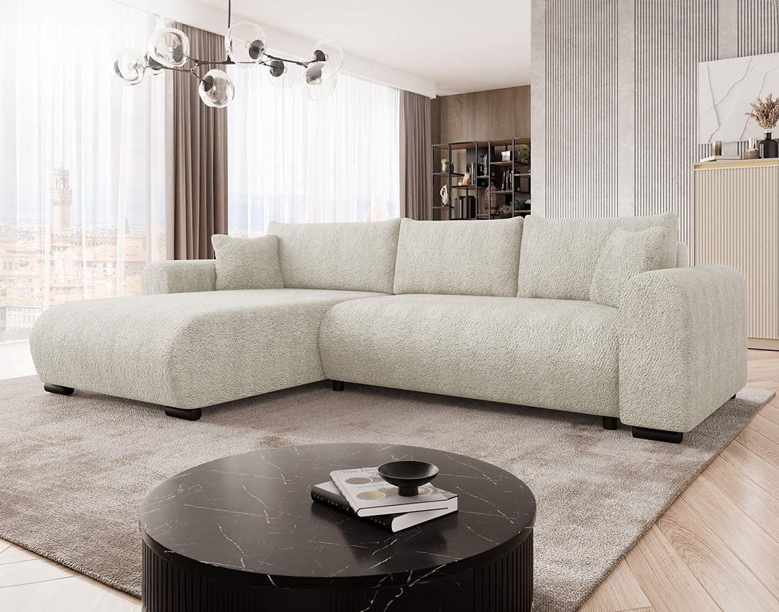 | Libellé | Rosalie - Canapé d'angle réversible 4 places convertible avec coffre en tissu bouclette |
