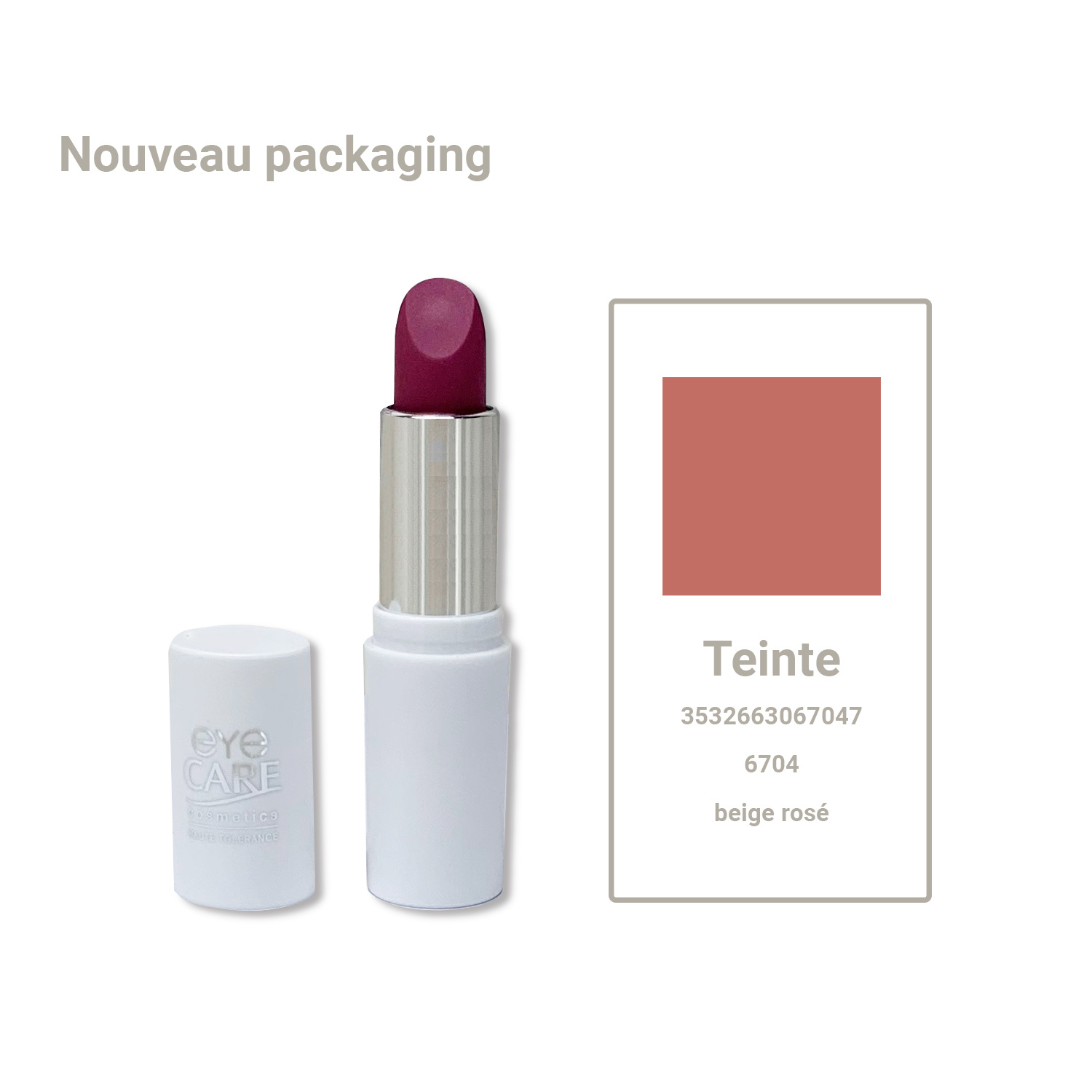 Rouge à lèvres satin beige rose, 4g Eye care haute tolérance reconstituent les lèvres desséchées et assurent confort et longue tenue.