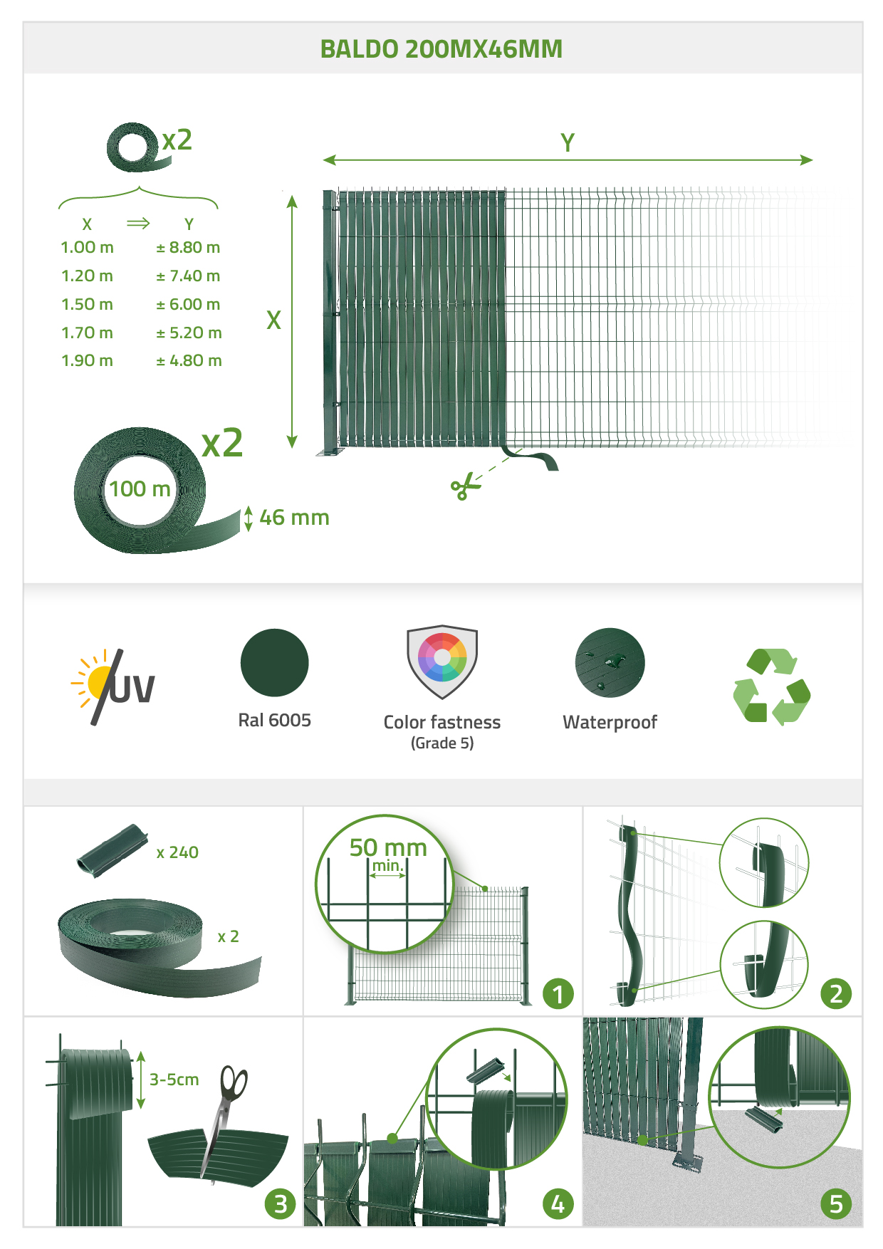 | Libellé | Rouleau Brise-vue PVC Souple BALDO 200m x 46 mm Vert – Kit Occultation avec Profil & Clips |