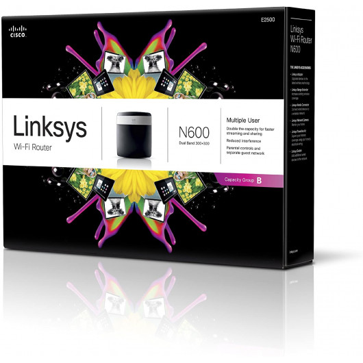 Le Linksys E2500 offre une vitesse sans fil supérieure (jusqu'à 300 + 300 Mbps), une portée optimale et une puissante technologie double bande pour fournir des performances avancées aux foyers sans fil actifs. La technologie double bande simultanée (2,4 + 5 GHz) double la bande passante de votre réseau et aide à éviter les interférences réseau, permettant une diffusion multimédia et des transferts de fichiers plus fluides et plus rapides. Un réseau d'antennes MIMO offre une portée et une fiabilité supérieures. Et le cryptage WPA/WPA2 et le pare-feu SPI aident à protéger votre réseau. De plus, le logiciel Cisco Connect inclus vous permet une configuration en trois étapes faciles et offre des outils puissants pour la gestion continue de votre réseau.