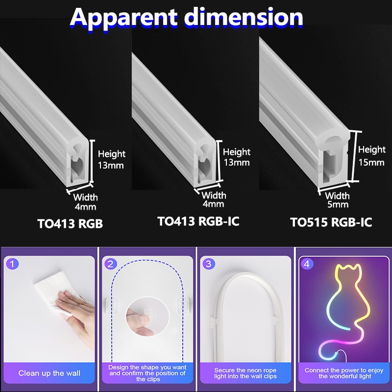 Paramètres: Type de LED: 3535, Tension de sortie: 24V, Couleur de la lumière: RGB, Indice de protection: IP67, Méthode de contrôle: Télécommande/Bluetooth, Taille de la lumière néon: 4x13mm, Distance de coupe: 5 LED/8.4cm, Quantité de LED: 60 LED/mètre