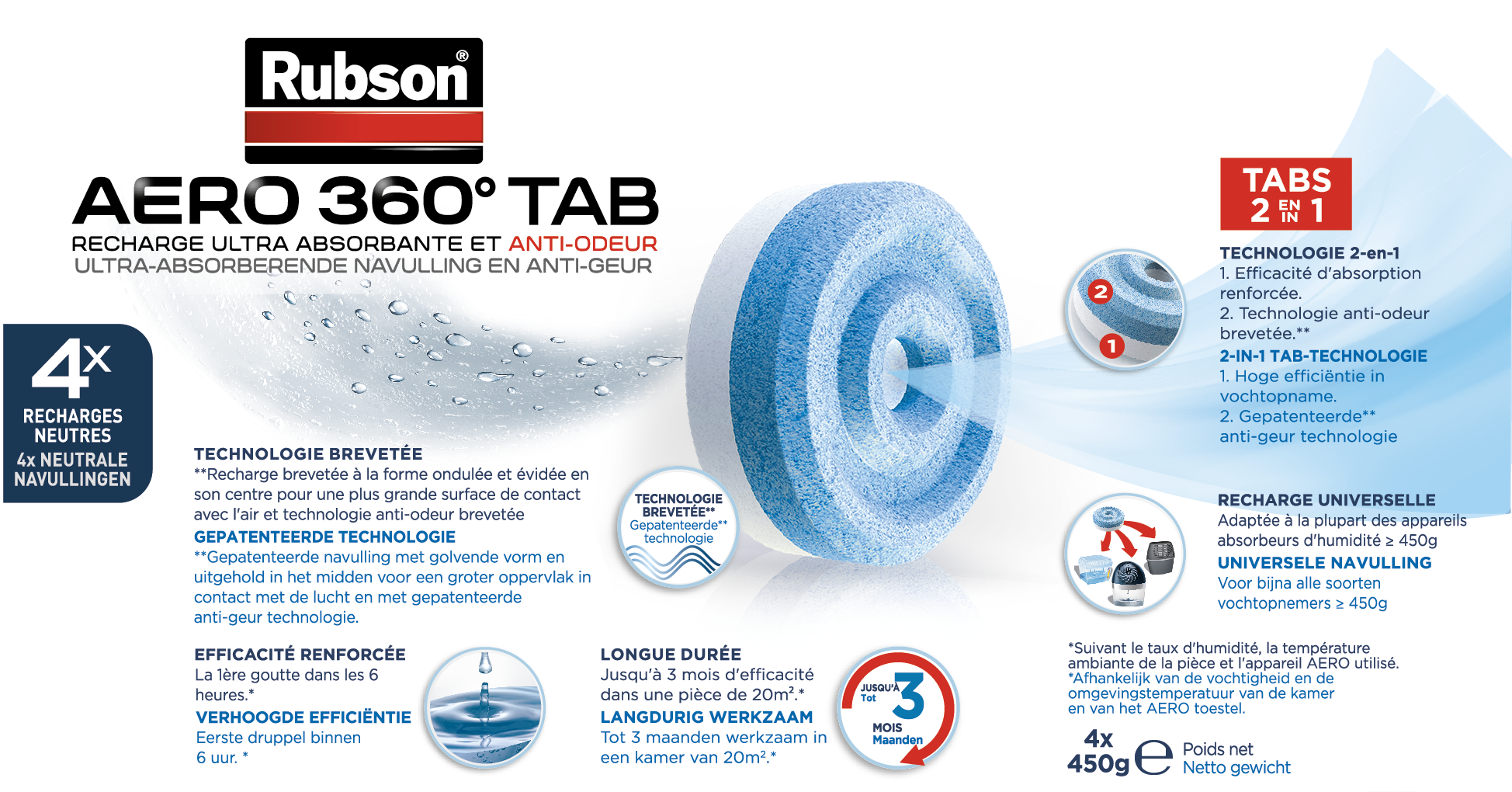 Anti-humidité : la recharge RUBSON absorbe l'excès d'humidité dans l'air et le réduit immédiatement en liquide : jusqu'à 40% d'eau absorbée en plus. Apparition de la 1ère goutte d'eau dans les 12H. Anti-Odeur: la technologie anti-odeur breveté réduit efficacement jusqu'à 70% des mauvaises odeurs sans les masquer. Produits dangereux - Respecter les précautions d'emploi