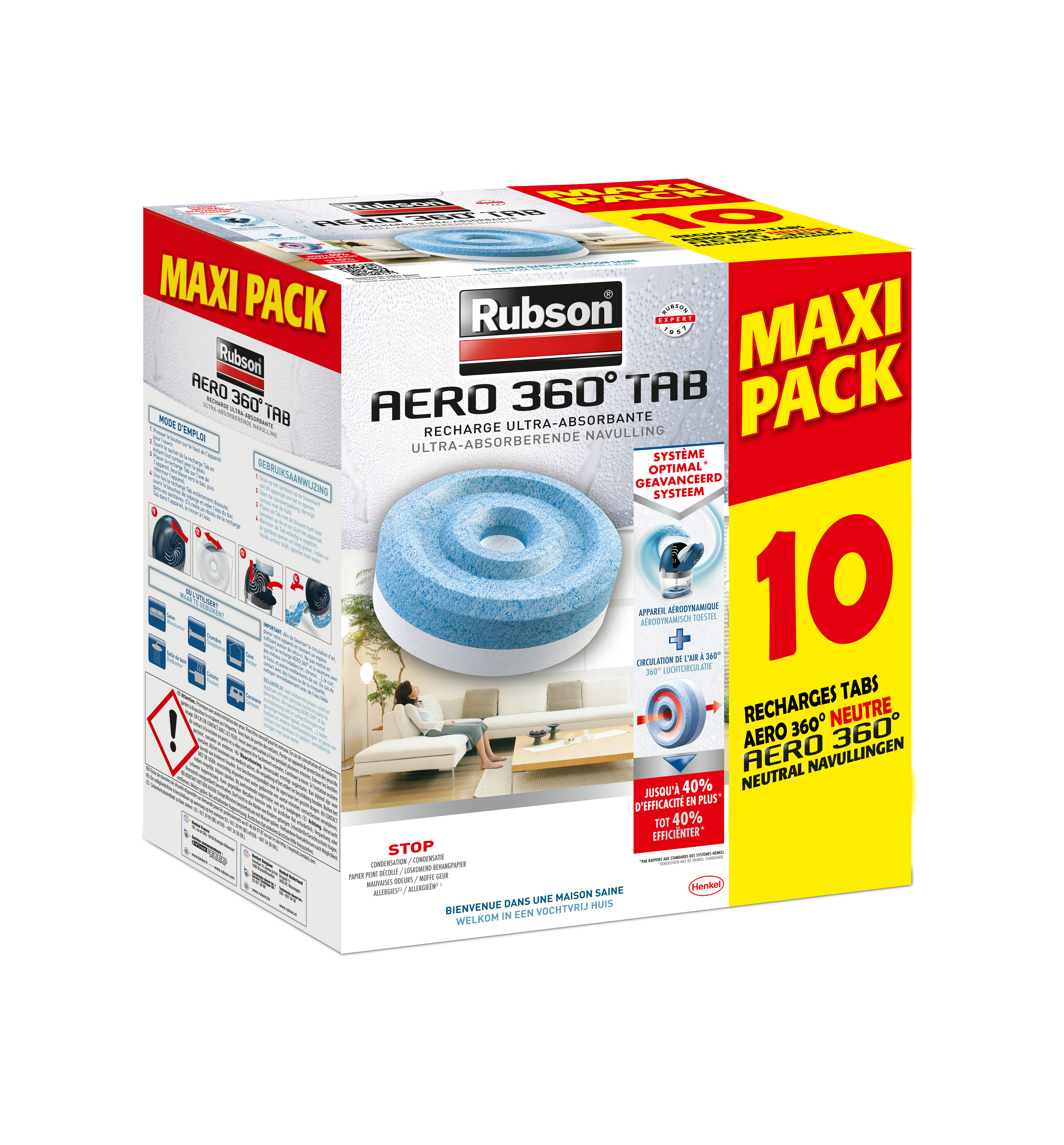 Les recharges AERO 360° TAB (2en1) conçues pour l’appareil RUBSON AERO 360° bénéficient de la technologie exclusive AERO 360° qui leur confère une efficacité renforcée par rapport à une recharge classique. Grâce à leur surface de contact avec l’air plus importante, les recharges AERO 360° TAB luttent de manière plus efficace et plus rapide contre l’humidité et les mauvaises odeurs. L’absorbeur AERO 360° de Rubson est adapté à toutes les pièces de la maison : salle à manger, salon, chambre à coucher, bibliothèque, bureau …