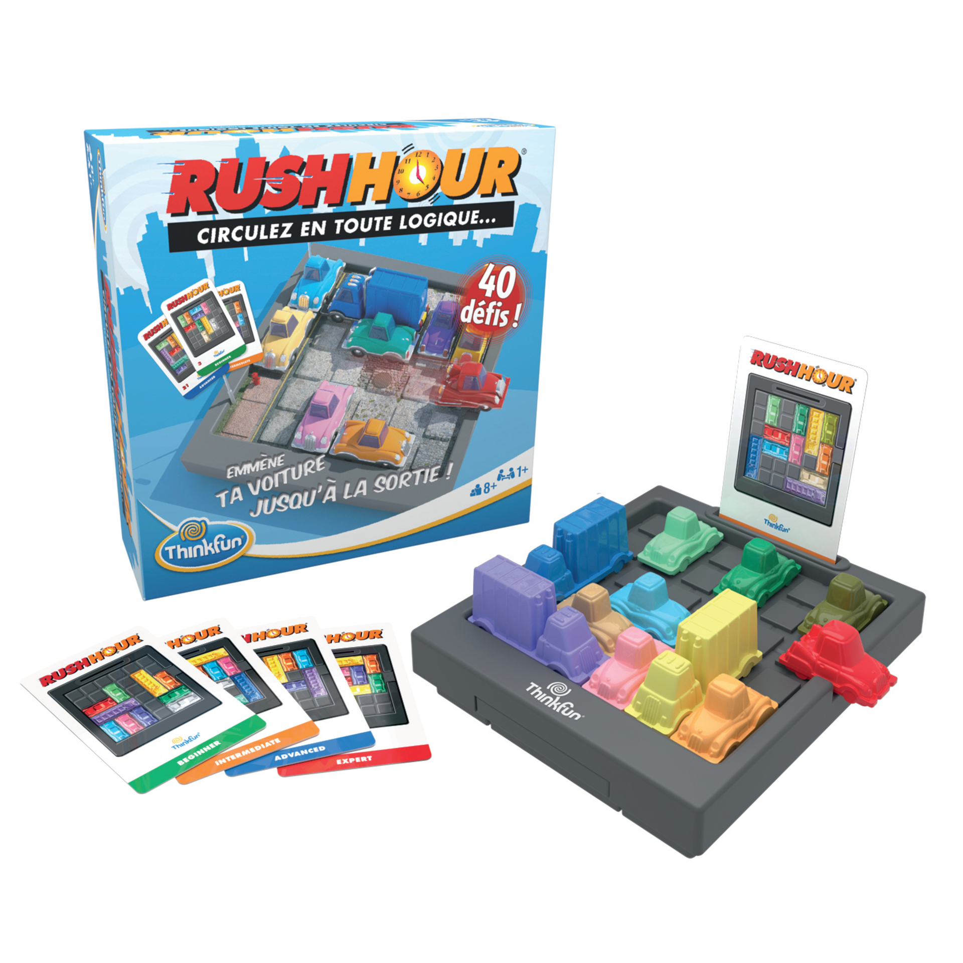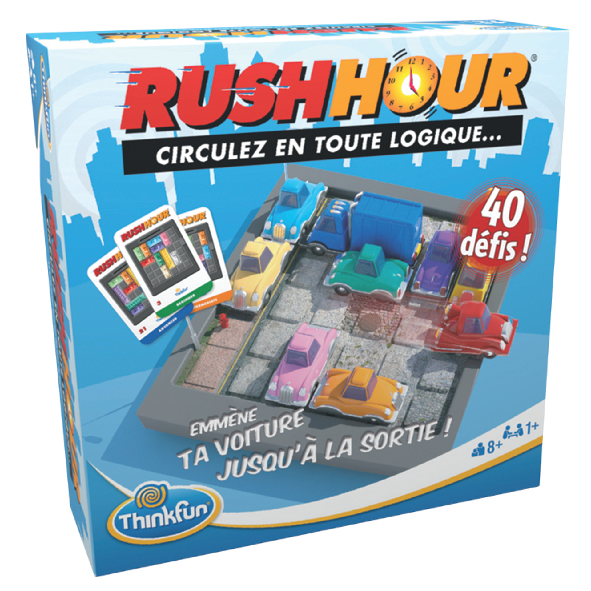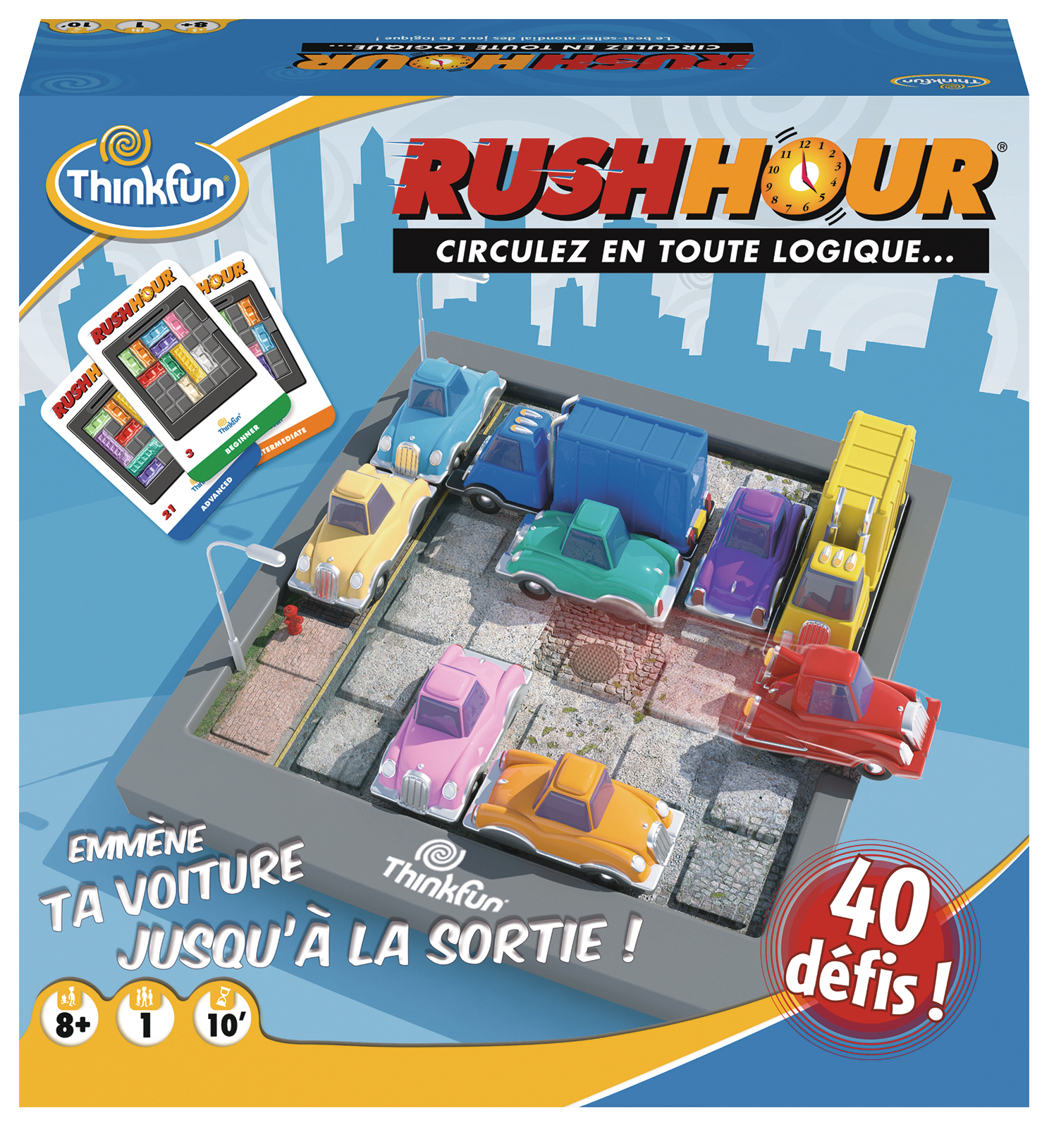 | Plus produit | LE CÉLÈBRE JEU DE LOGIQUE : best-seller mondial des jeux de logique dans sa version classique ! Dans ce jeu, les enfants à partir de 8 ans s\'initient au célèbre jeu de l\'embouteillage en relevant les 40 défis de façon progressive (4 niveaux de difficulté). Alors c\'est parti, attachez votre ceinture ! DES RÈGLES SIMPLES : Votre objectif, sortir la voiture rouge de l\'embouteillage ! Pour y parvenir, déplacez les véhicules qui bloquent cette voiture rouge de haut en bas, de gauche à droite, et vice-versa, pour libérer le passage ! Ce jeu développe les capacités de raisonnement et aiguise l\'esprit de toute la famille à partir de 8 ans. NIVEAUX ÉVOLUTIFS : Ce jeu est évolutif et permet à votre enfant de progresser à son rythme. Il contient 40 défis inédits, avec 4 niveaux de difficulté (facile - intermédiaire - difficile - expert). Grâce à une mise en place et une manipulation facile, votre enfant sera très vite autonome. Pratique avec le sac de transport pour jouer partout ! PARTIES DIFFÉRENTES : avec ses 40 défis, ce jeu de logique fera travailler les méninges de toute la famille ! Vous en voulez plus ? Retrouvez aussi les 3 recharges Rush Hour contenant chacune 40 nouveaux défis et un véhicule spécial (un cabriolet, une limousine, un taxi) ! Stimule le raisonnement logique et l\'esprit critique de manière amusante ! CONTENU : Un plateau de jeu Rush Hour® avec un rangement de carte intégré, 15 véhicules de blocage, 1 voiture rouge, 40 cartes défis, un sac de rangement et une règle du jeu. Jouable seul ou à plusieurs, à partir de 8 ans et surtout le temps de jeu est illimité. |