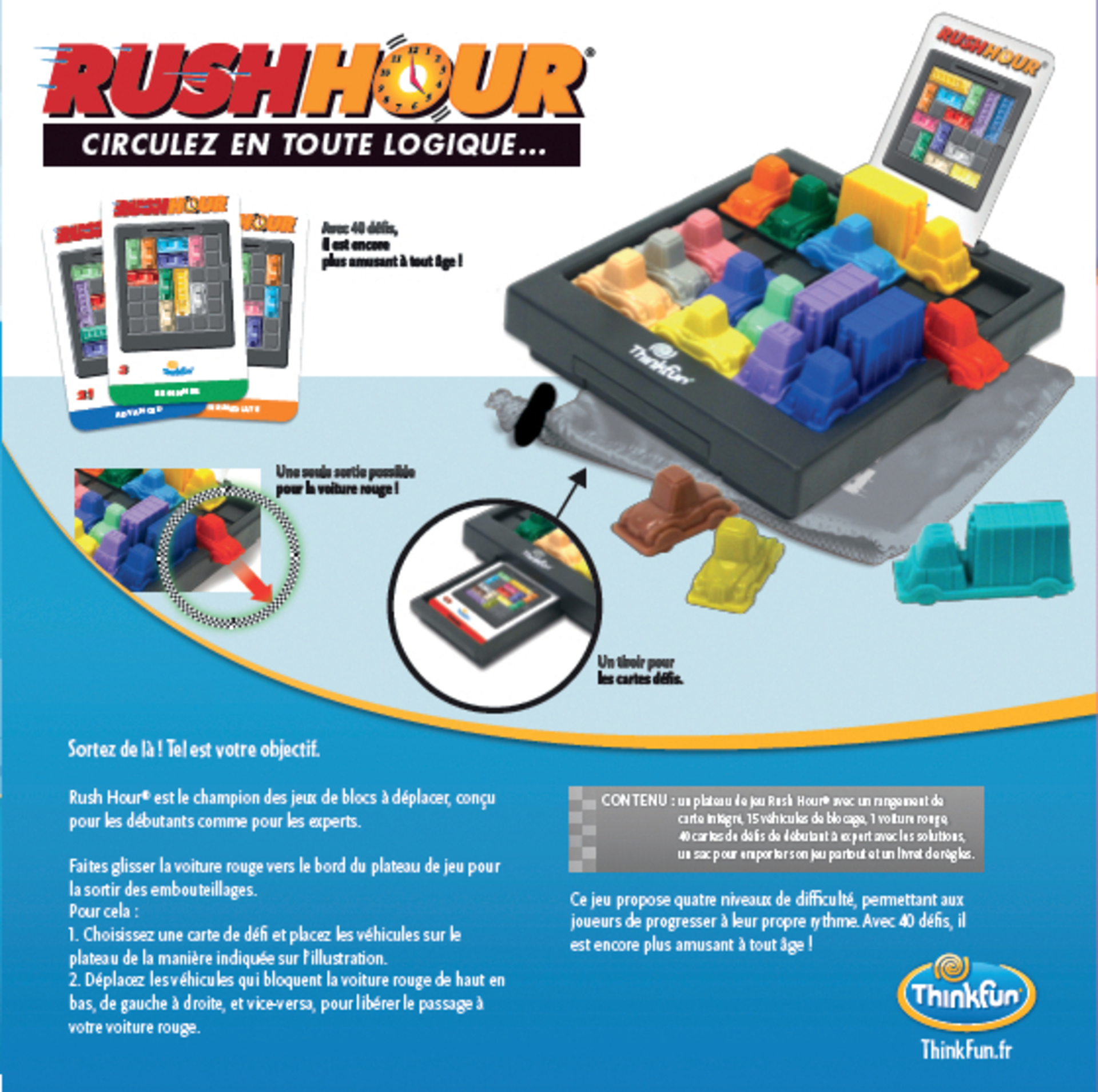 | La boîte contient | Un plateau de jeu Rush Hour® avec un rangement de carte intégré, 15 véhicules de blocage, 1 voiture rouge, 40 cartes de défis de débutant à expert avec les solutions, un sac pour emporter son jeu partout et un livret de règles. |