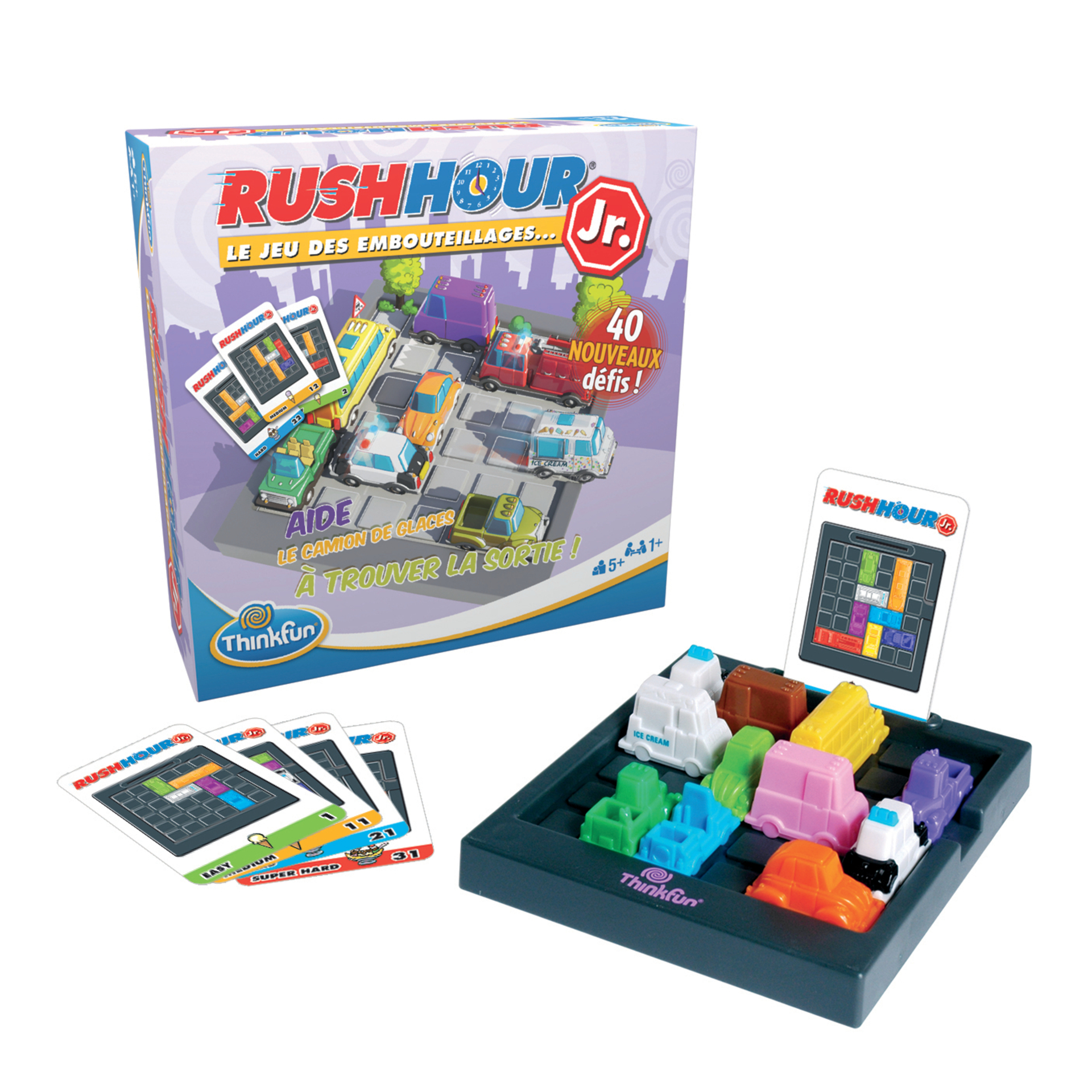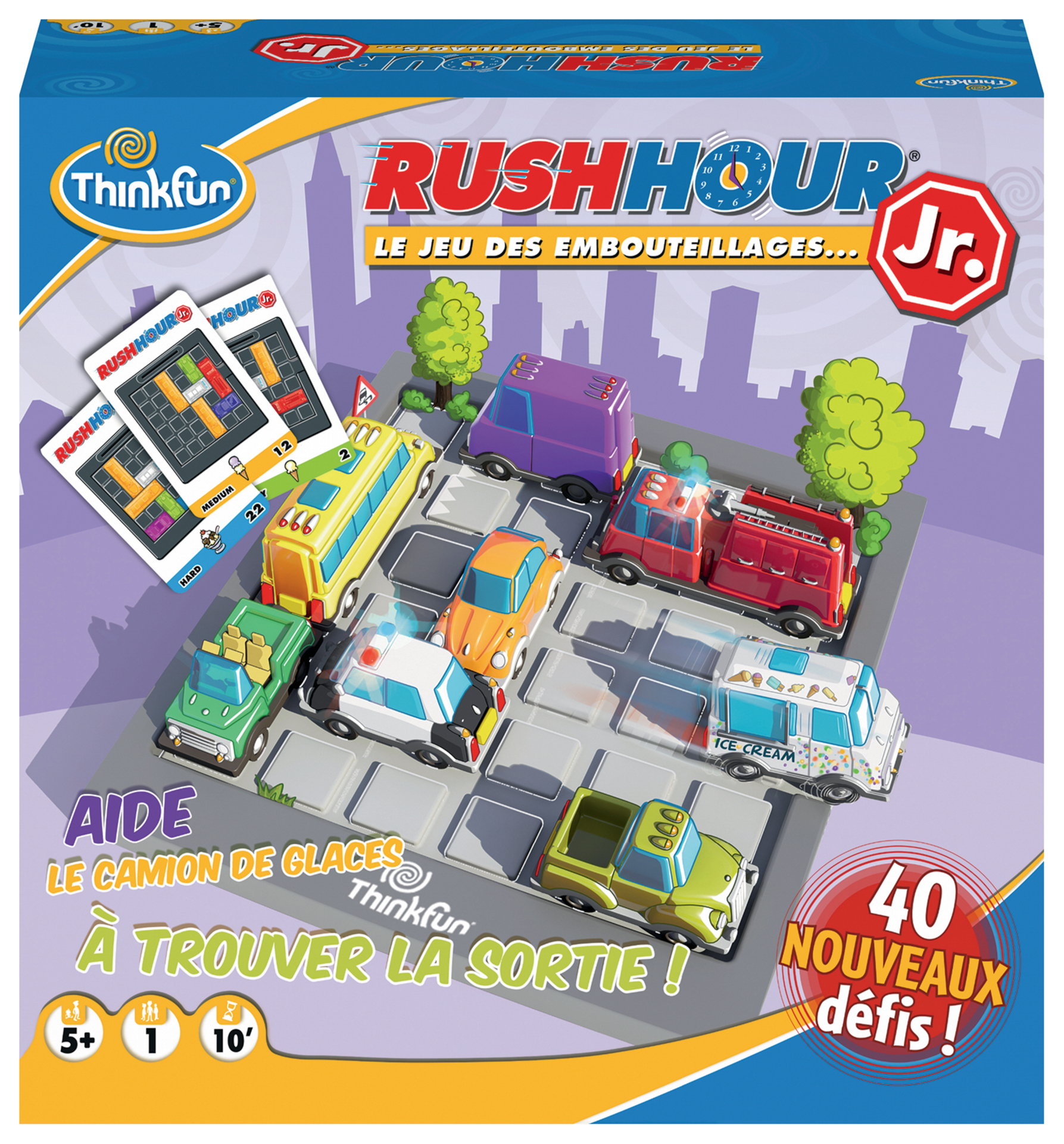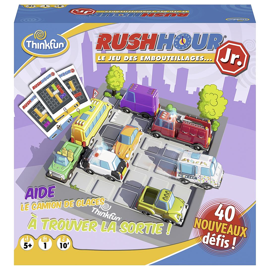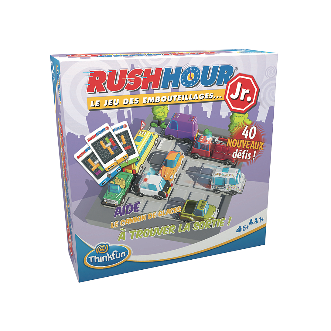 Au secours !Le camion de glaces est coincé dans les embouteillages ! Comme dans la version classique du Rush Hour®, le célèbre jeu des embouteillages, vous devez faire glisser les voitures et les camions hors de votre chemin pour dégager la voie vers la sortie au camion de glaces. Pour commencer : choisissez une carte de défi et placez les voitures et les camions sur la grille de tracé comme indiqué sur la carte. Votre but : emmenez votre camion de glaces jusqu'à la sortie. Faites glisser les voitures et les camions pour dégager votre route jusqu'à ce que la voie soit libre. Vous trouverez 40 nouvelles cartes défis de quatre niveaux de difficulté, spécialement conçues pour des enfants à partir de 5 ans. Ce casse-tête à difficulté graduelle est un moyen amusant d'entraîner vos capacités de déduction. Rush Hour® Jr. est le jeu idéal pour tous les enfants, petits et grands, même un adulte y trouvera un défi à sa mesure.