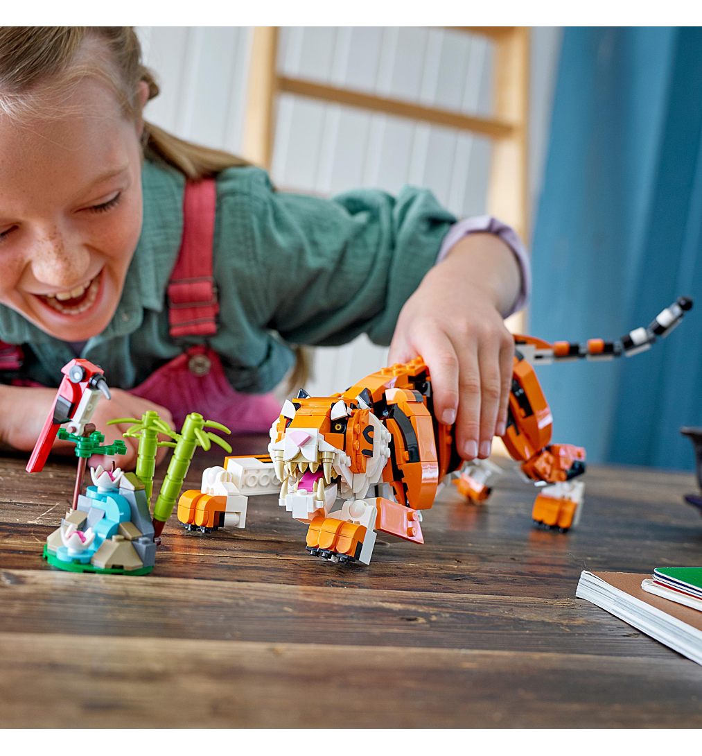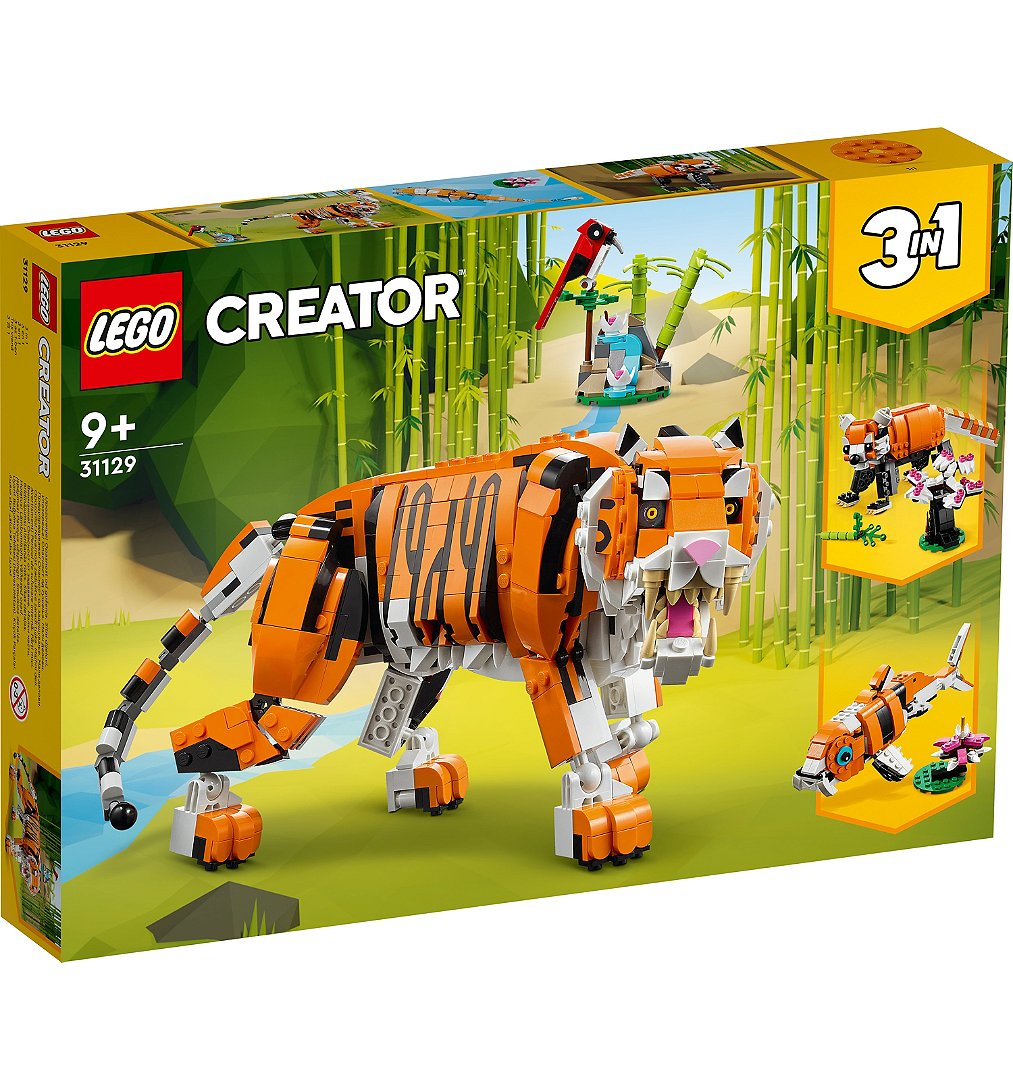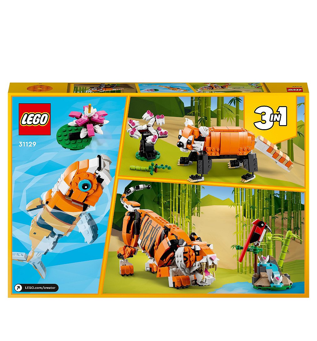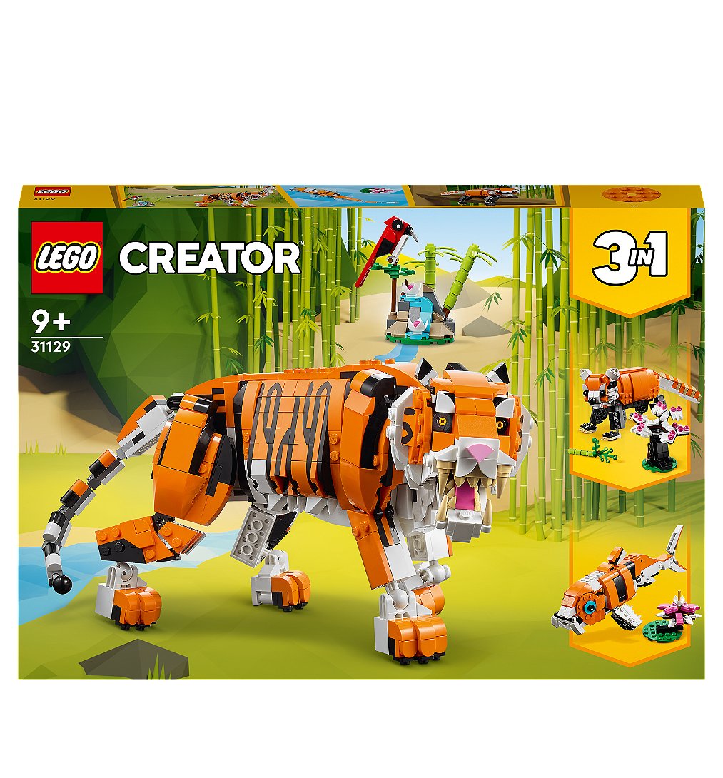 | Plus produit | Les passionnés danimaux peuvent inventer des histoires passionnantes avec le set LEGO® Creator 3-en-1 Sa Majesté le Tigre, qui peut être transformé en panda roux ou en carpe koï. |